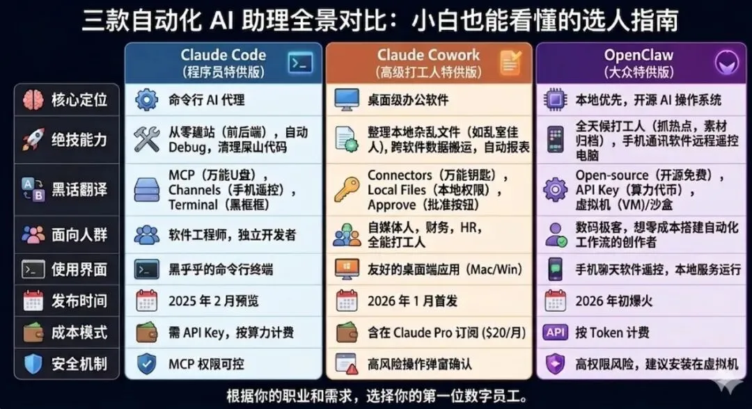 今天,我们就用大白话彻底扒一扒目前市面上最强悍的三款自动化 AI 工具:Claude Code、Claude Cowork,以及开源圈的当红炸子鸡 OpenClaw。不管你是天天敲代码的硬核玩家,还是每天对着一堆文档和表格发愁的普通打工人,这篇文章都能帮你找到最适合你的“全自动搭子”!