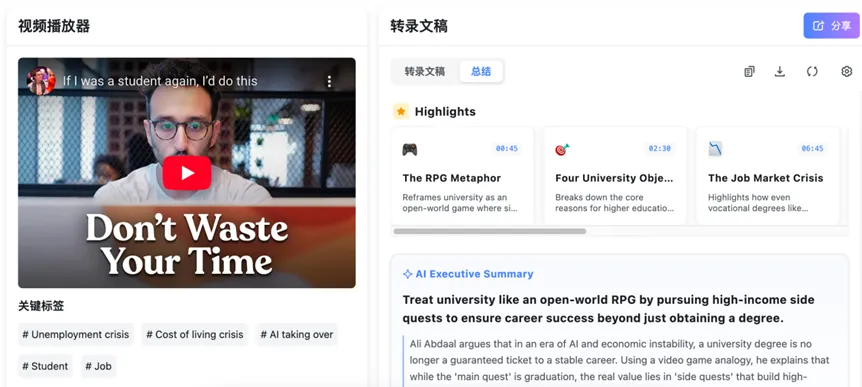 YouTube视频转录: 依托 AI 完成视频关键词精准分析,支持100 + 种语言的视频转录几秒内自动生成带智能章节、精准时间戳的逐字稿,可以直接跳转到你需要的内容,还能快速提炼核心内容,让你不用看完整视频就能掌握重点。 重要的是100%免费,且无需注册就能获取无限转录,只需要粘贴YouTube的链接就可以开始转录,支持一键复制转文本到剪贴板或导出 除此之外,还可以搭配专属免费 Chrome 插件,直接在 YouTube 视频观看页面就能生成转录和摘要,可以边看视频边使用,提升学习效率!