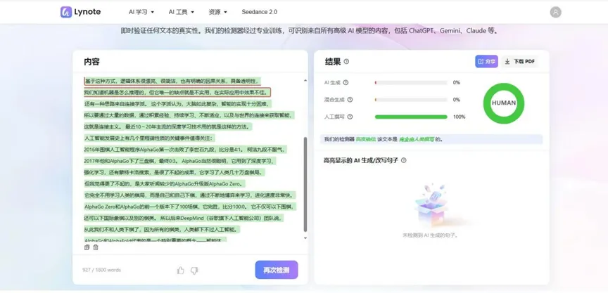 AI检测器: 可以 ChatGPT、Claude 还是 Gemini 等高级AI模型的内容,Lynote 支持秒级扫描,精准识别文本中的 AI 痕迹并给到直观洞察,高亮显示可能由AI生成的具体句子,让你能精准定位。无论是润色论文还是审核投稿,帮你提前预警潜在的AI率风险。80+种语言支持,支持长文本检测,99%准确率对标行业顶尖水平,且每日有20次免费使用次数。