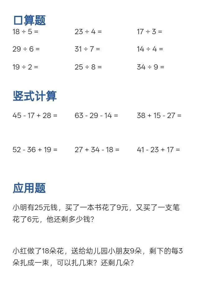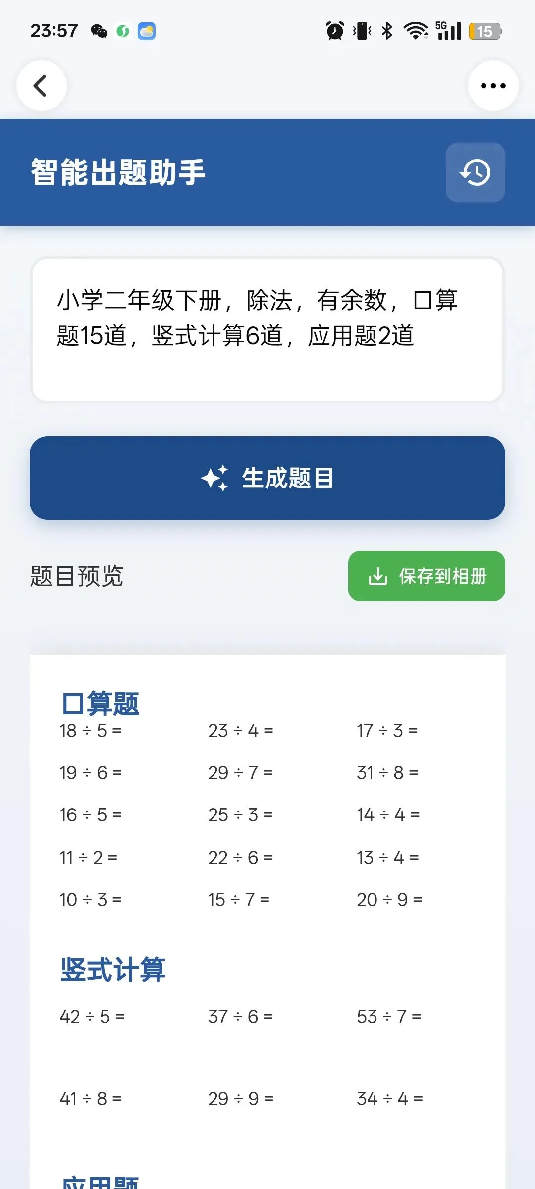 我灵光一闪,花了一个晚上(出题一分钟,排版两小时),自己做了这个小小的出题工具。输入你的要求,比如说,二年级数学下册,除法,有余数,口算题20道,加减混合竖式计算6道,应用题2道,一键实现出题 + 排版,直接保存到相册,拿去就能打印。如果你家里的打印机和手机连接,你甚至直接可以从手机打印。