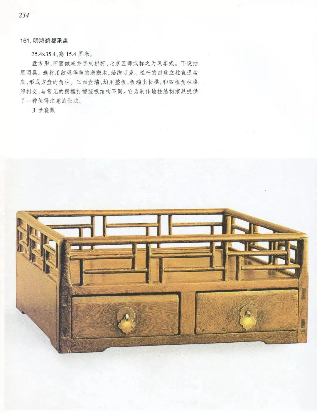 王世襄的《明式家具研究》中写道,都承盘又叫“都丞盘”、“都盛盘”或者“都珍盘”。从命名中可以看出,这种小家具主要在于收纳功能,用以收放文物、文玩等案头小家具。简言之,就是今天桌面上用于收纳文件的收纳盒。前文人放于桌案用来储存收纳笔墨纸砚的文房家具。