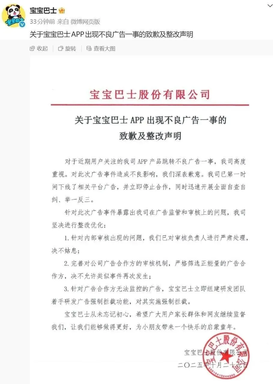 为了微不足道的广告收益,儿童教育平台放任低俗广告侵入孩子的世界,不仅违背了教育初心,更践踏了千万家庭的信任。