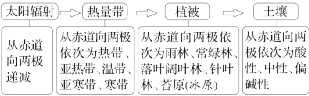 (3)中纬度地区分异明显的原因:北半球中纬度地区陆地广阔, 明显,从沿海向内陆, 条件差异大,所以自然地带分异明显。