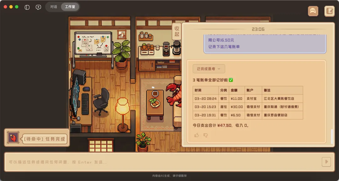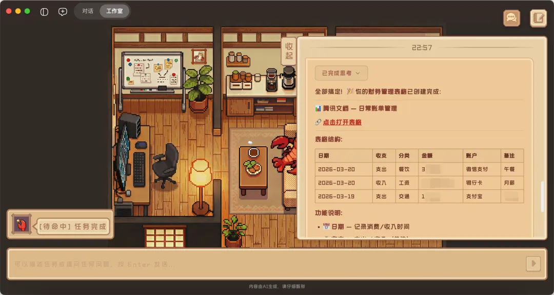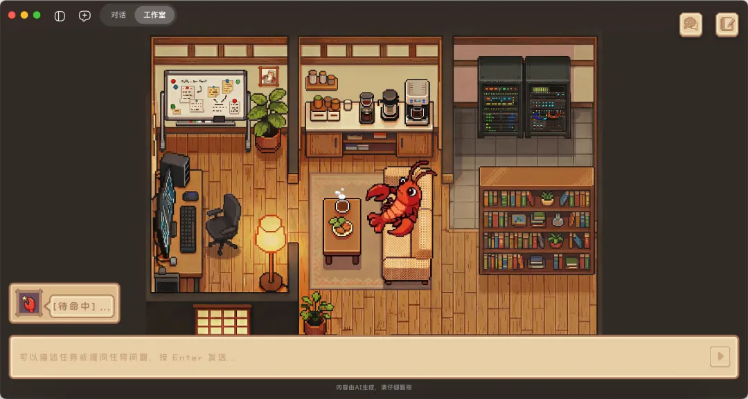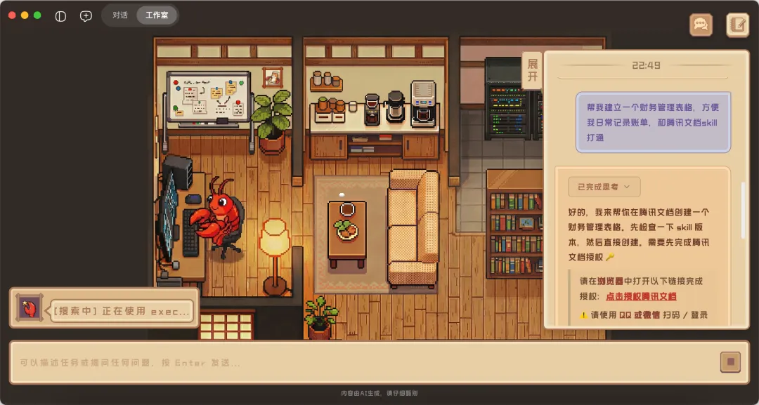 腾讯QClaw是腾讯版小龙虾,能够直连微信,可以通过微信远程遥控小龙虾干活。近日新增了龙虾工作室界面,可以在电脑端实时查看龙虾工作状态,包括是否在摸鱼、或是写代码还是在整理文档,界面非常有趣。