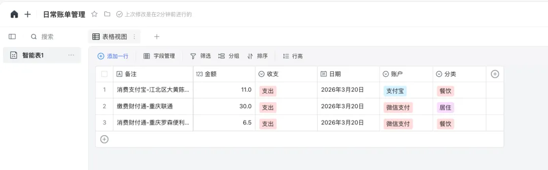 完成skill安装后,龙虾会自动生成账单管理表格,并生成了三个示例