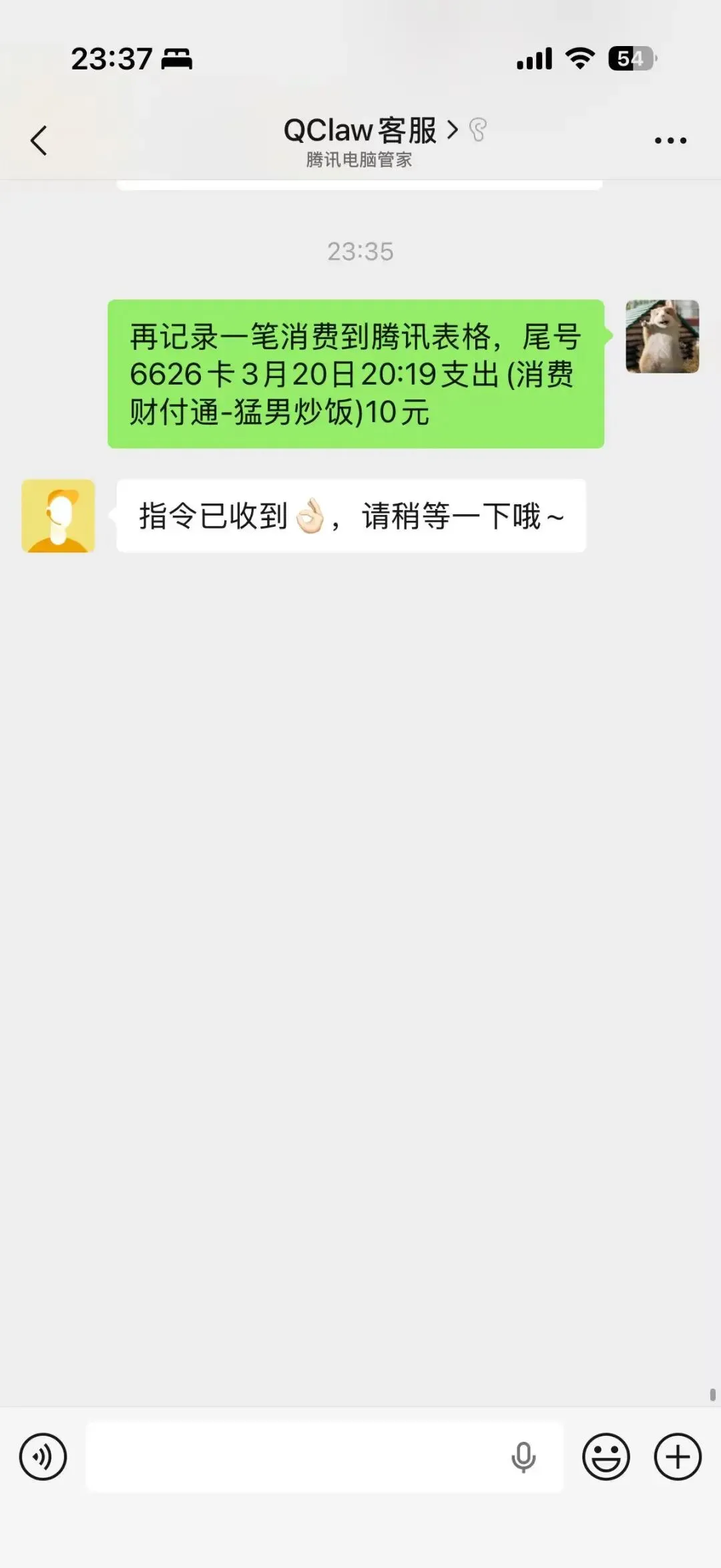 至此表格建立完成,可以将每日消费短信发送给他,让他自动记录到表格内,例如将以下指令发给龙虾