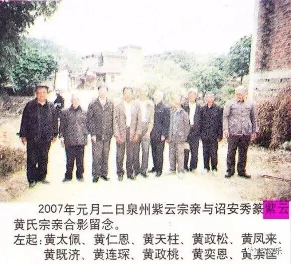 应特别指出的是:2007年元月2日,黄既济、黄天柱一行利用到秀篆并和秀篆黄氏宗亲合影一事作为依据,称“秀篆黄氏是泉州紫云守恭公派下”,并在合影相片冠以“诏安秀篆紫云黄氏”,这是不负责任的做法应于纠正。今天与会的宗亲黄连琛、黄仁思、黄太佩(当时参加合影的其中三位宗亲)明确表态,当时即告知黄既济一行,秀篆黄氏为峭公后裔。