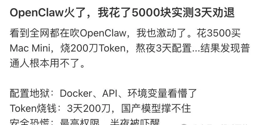 而我们中的大多数的普通人 ,还在为“如何安装”而焦头烂额,在网上搜索看了各位博主分享的教程,花上十几个小时去折腾部署,要么图便利省事,咬牙花上500-3000元的费用请人上门安装,好不容易部署好了,又被高昂的使用成本吓得不敢动弹。我们以为的“生产力工具”,成了一个奢侈的“玩具”。