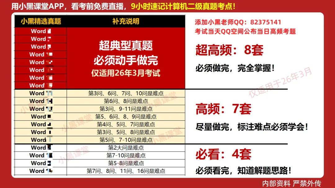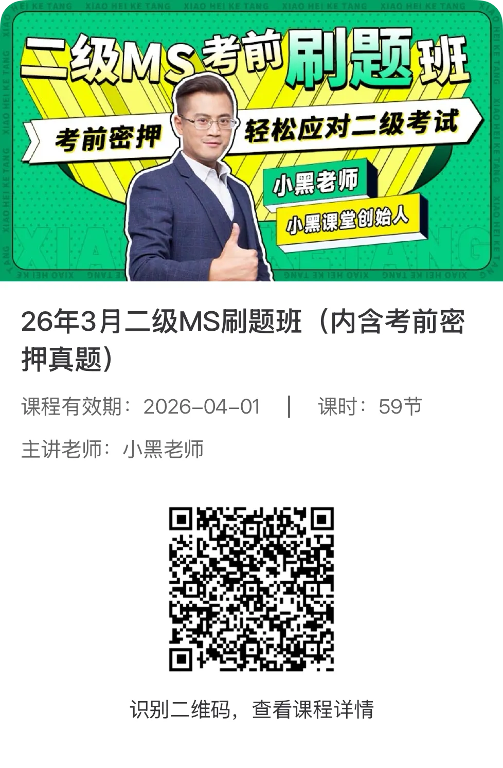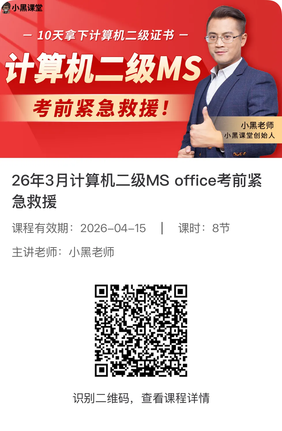 从3月18日起,小黑老师晚上7点每天1.5小时直播,干货满满,毫无保留,把二级考到的高频知识点(Word,Excel,PPT,选择题都有)全部精讲一遍。通过系统的学习,切实可行的提高二级分数