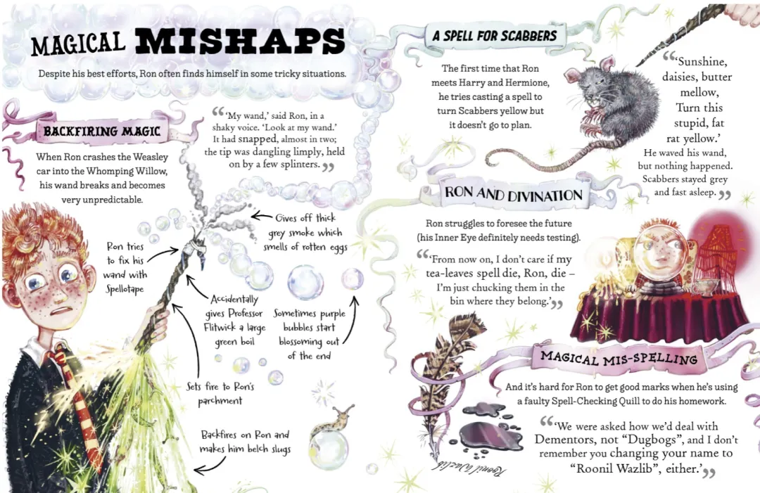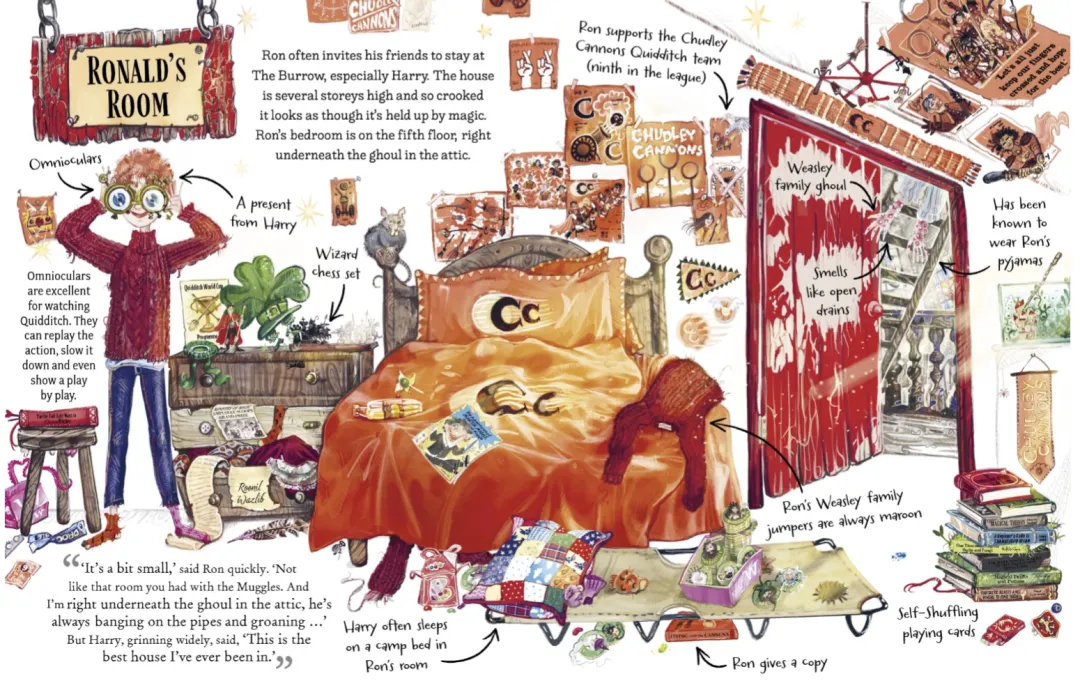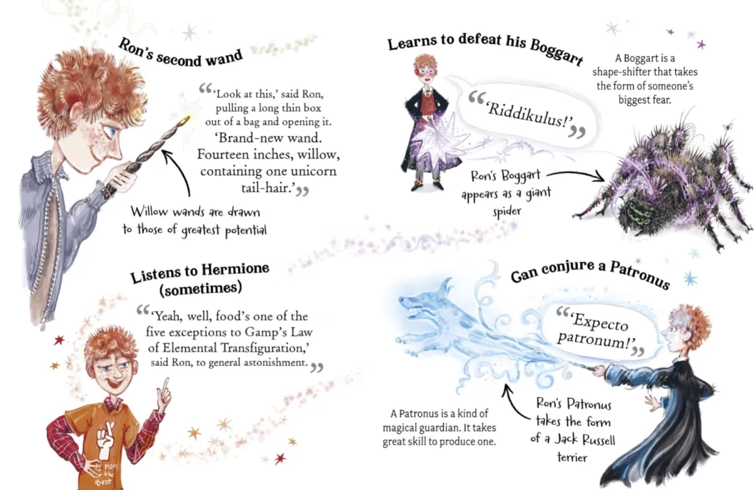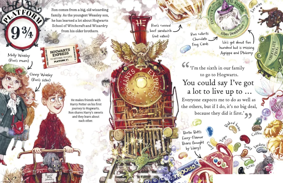 更惊喜的是,书中还藏着许多“冷知识彩蛋”——哈利第一次收到的猫头鹰邮件细节、罗恩的魔杖木材与杖芯、赫敏调制复方汤剂的小诀窍、邓布利多办公室里的秘密,甚至卢娜坚信存在的弯角鼾兽的小设定,都被一一收录,满足每一个哈迷的好奇心。