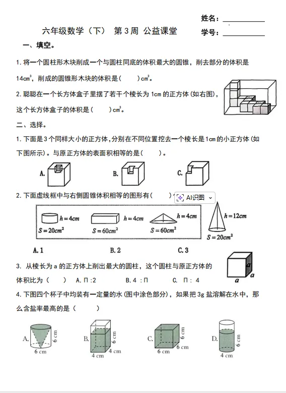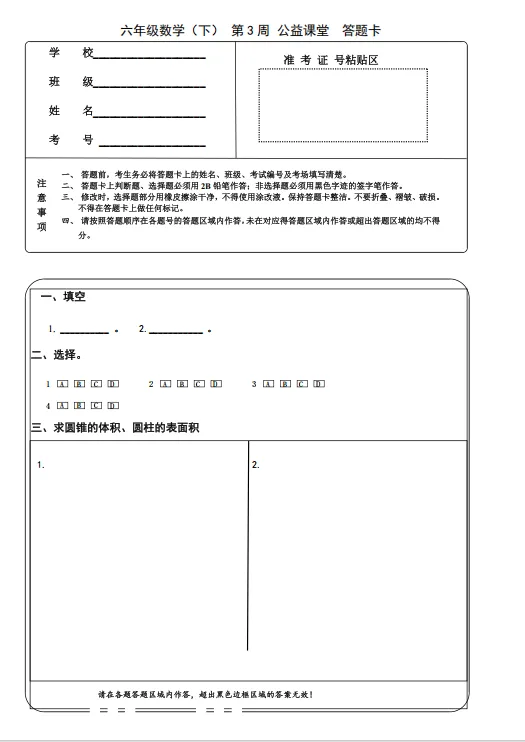 公益课堂|青岛版63制六年级数学(下)第3周练习及答题卡(文末附下载链接及参考答案) 好 好 学 习 报 效 祖 国 公益课堂 第3周:公益课堂 答题卡 电子版下载链接: 点击文末左下角“阅读原文”,输入提取码:8888,即可获取电子版资料。