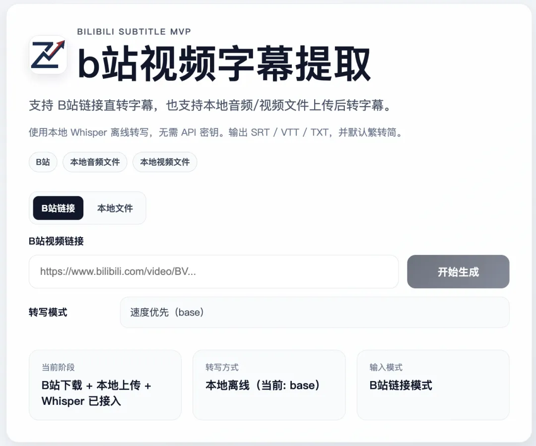 粘贴B站链接 → 自动提取音频 → Whisper转写 → 导出字幕文件