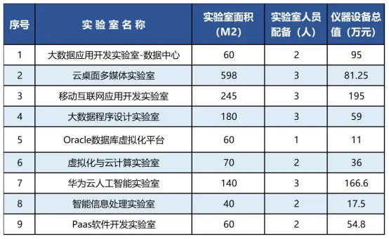 校企合作共建了大数据应用开发云实验室,目前已建设3期,包括大数据虚拟化管理平台、大数据挖掘与分析平台、大数据分析与挖掘算法应用平台、大数据可视化应用开发与展示平台等,此外,还建设了虚拟化与云计算实验室、智能信息处理实验室、程序设计仿真教学实验室、Paas软件开发实验室、华为云人工智能实验室、以及2个移动互联网应用开发实验室等,实验室设备较先进,空闲状态下均向师生全面开放,平均利用率达高,能够满足专业教学需求,在人才培养中能发挥较好作用。