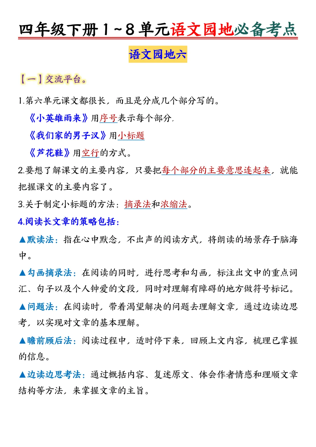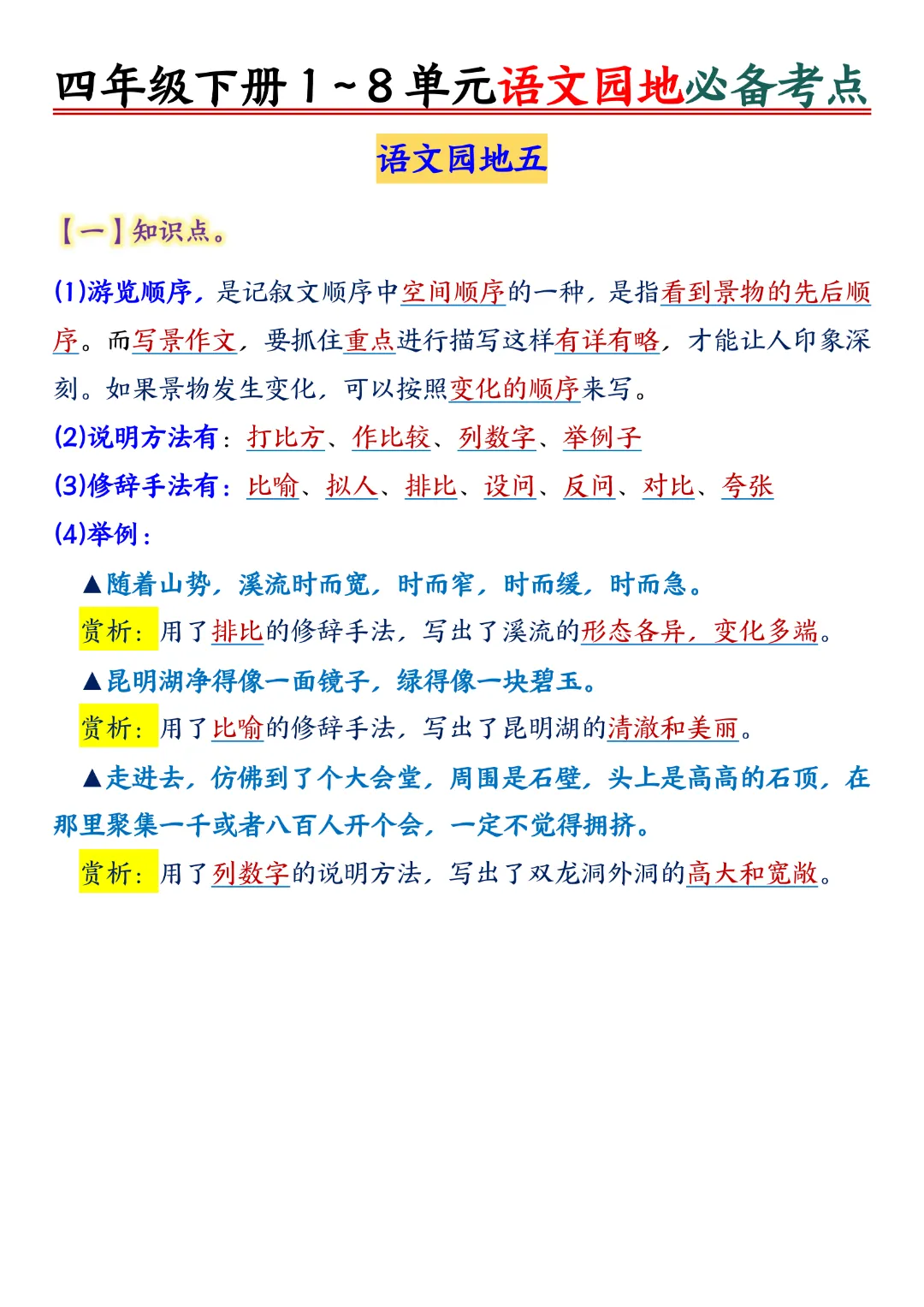 今天给大家分享的是:四年级下册语文【统编版】语文园地1-8单元必备考点丨完整高清电子版可打印