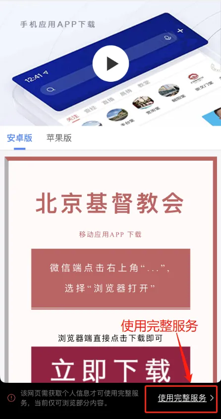 2、点击下方“使用完整服务”,安卓手机需在浏览器打开后下载,苹果手机识别二维码自动跳转下载界面。