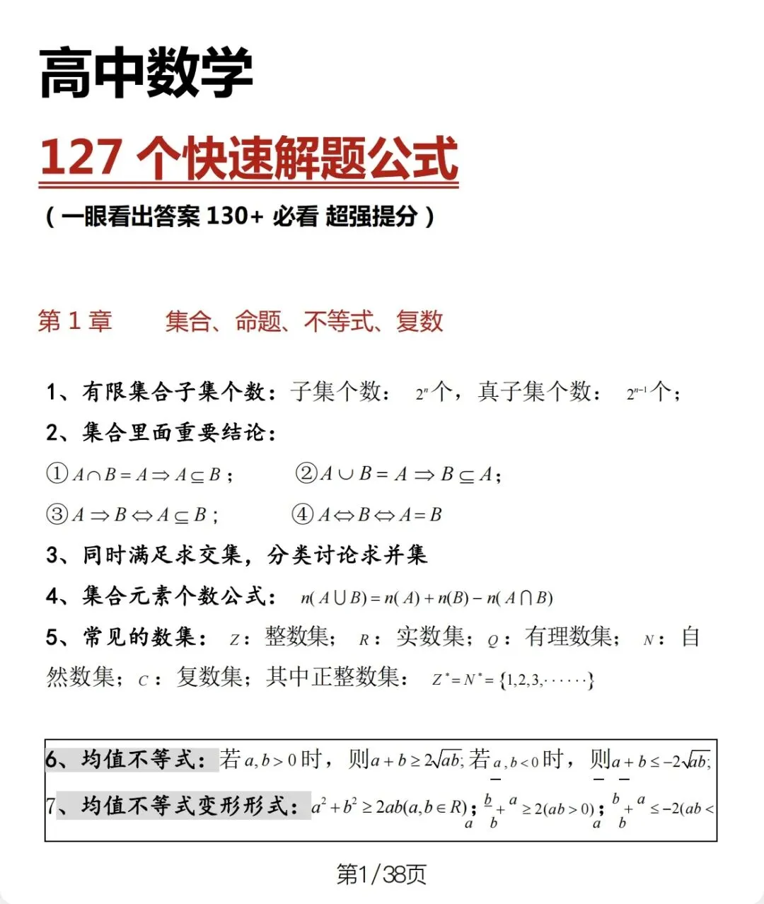 高考数学127个快速解题公式(可打印) 数学作为理科可以快速拉开差距的科目之一,掌握关键公式很重要!!!我为同学精选127个高中数学快速解题公式,涵盖集合,不等式等核心板块。总结二级结论和技巧,帮助化繁为简,提高解题速度,祝你冲刺130+!!! 篇幅有限,仅分享部分内容!!! 领取方式 1下方点赞+关注 2在对话框中回复111即可领取!!!
