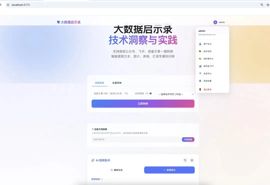 - 多平台图文解析与转换 :支持微信公众号、飞书文档、语雀等平台的文章一键抓取,并自动提取文本、图片、表格等内容,转换为精美的 Markdown 博客。