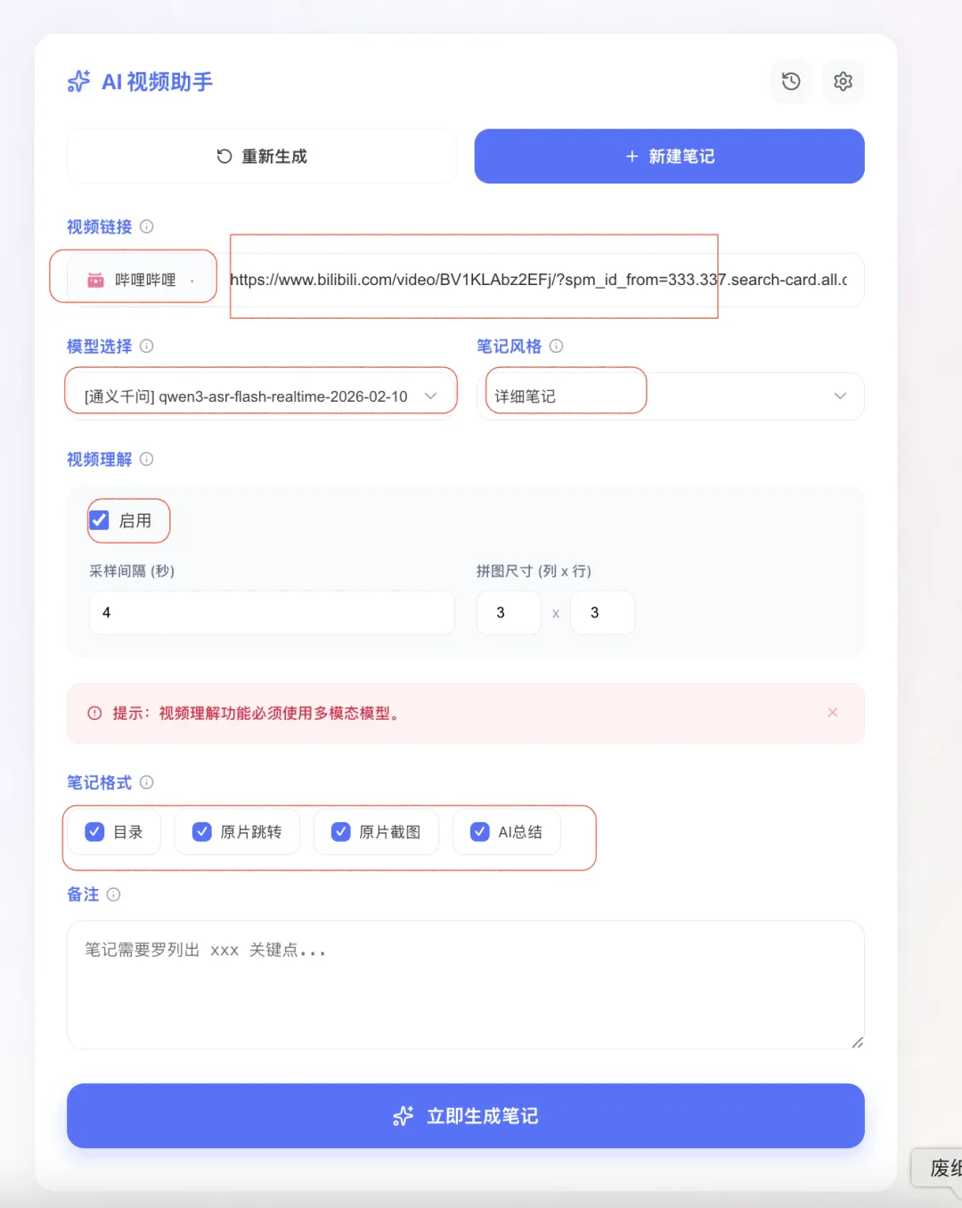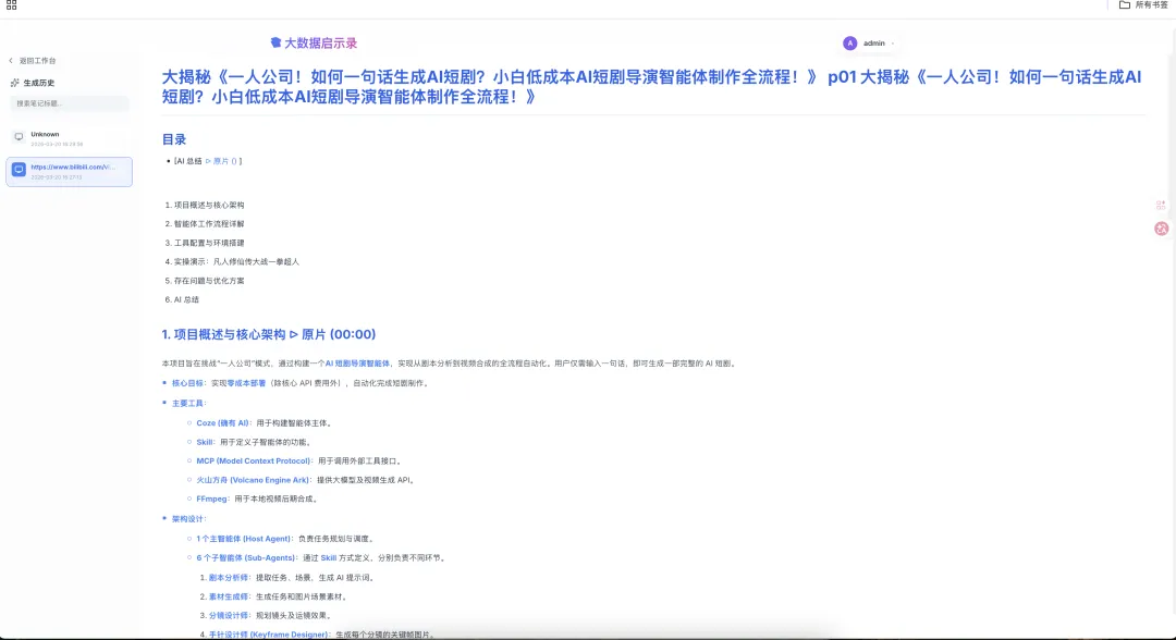 - 智能音视频笔记 (Video Assistant) :支持 B站、抖音、快手、YouTube 等平台的音视频下载;利用 Whisper 等模型提取字幕转写,并通过大模型生成内容摘要和实现视频问答。