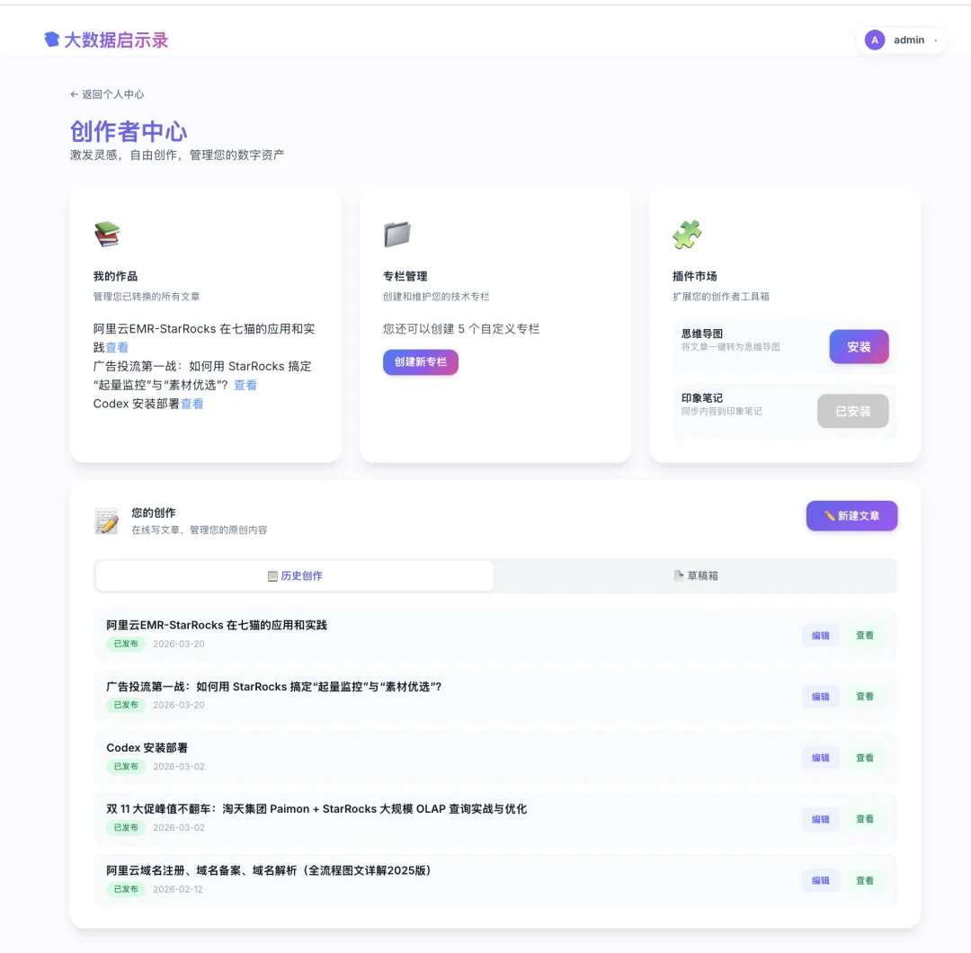 - 创作者经济与支付系统 :支持创作者创建付费专栏;集成微信支付、支付宝等 SDK,提供完整的订单流转与财务管理(充值、提现、购买记录)。