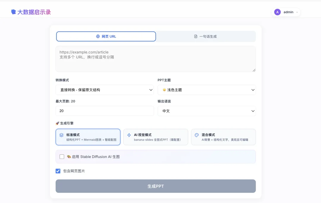 - 智能 PPT 生成 (UrlToPpt) :输入文章或网页链接,系统自动爬取内容、提取核心观点、生成配图并排版,最终导出专业的 PPT 幻灯片。