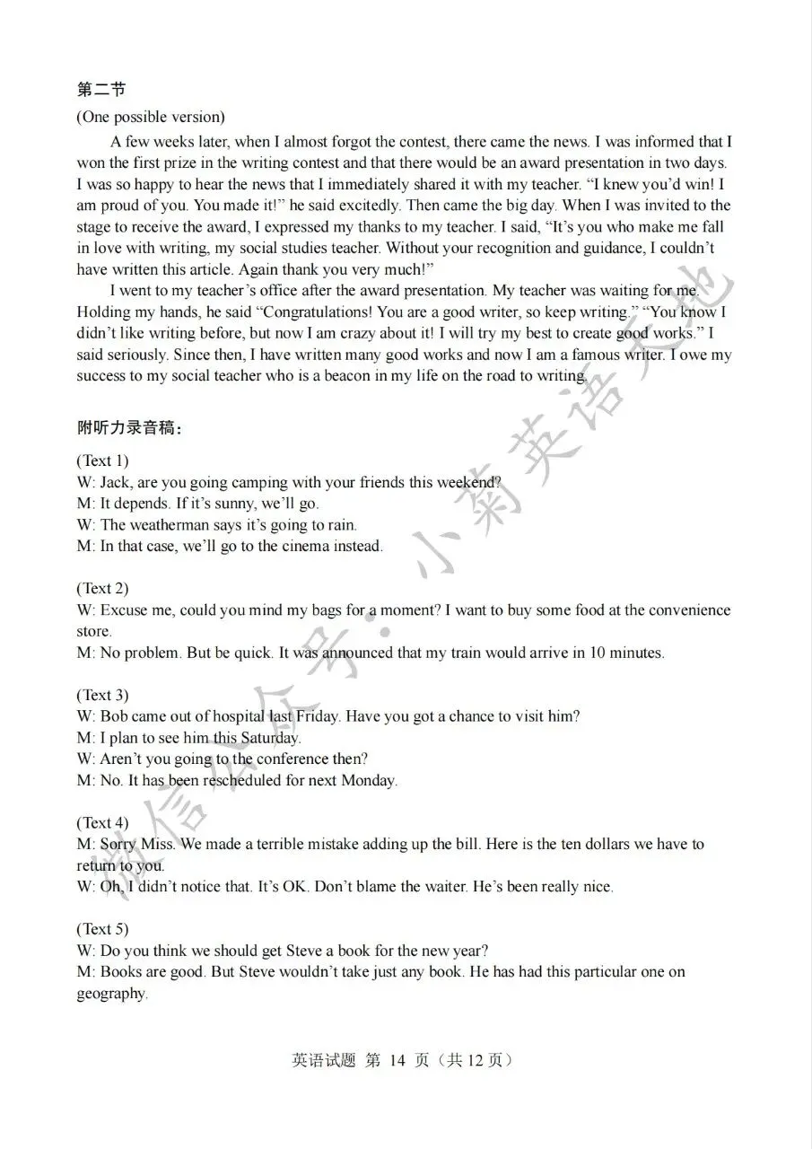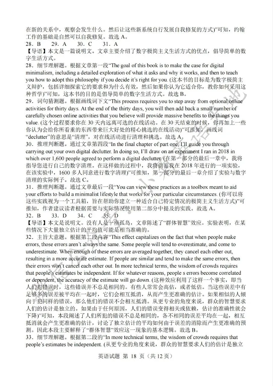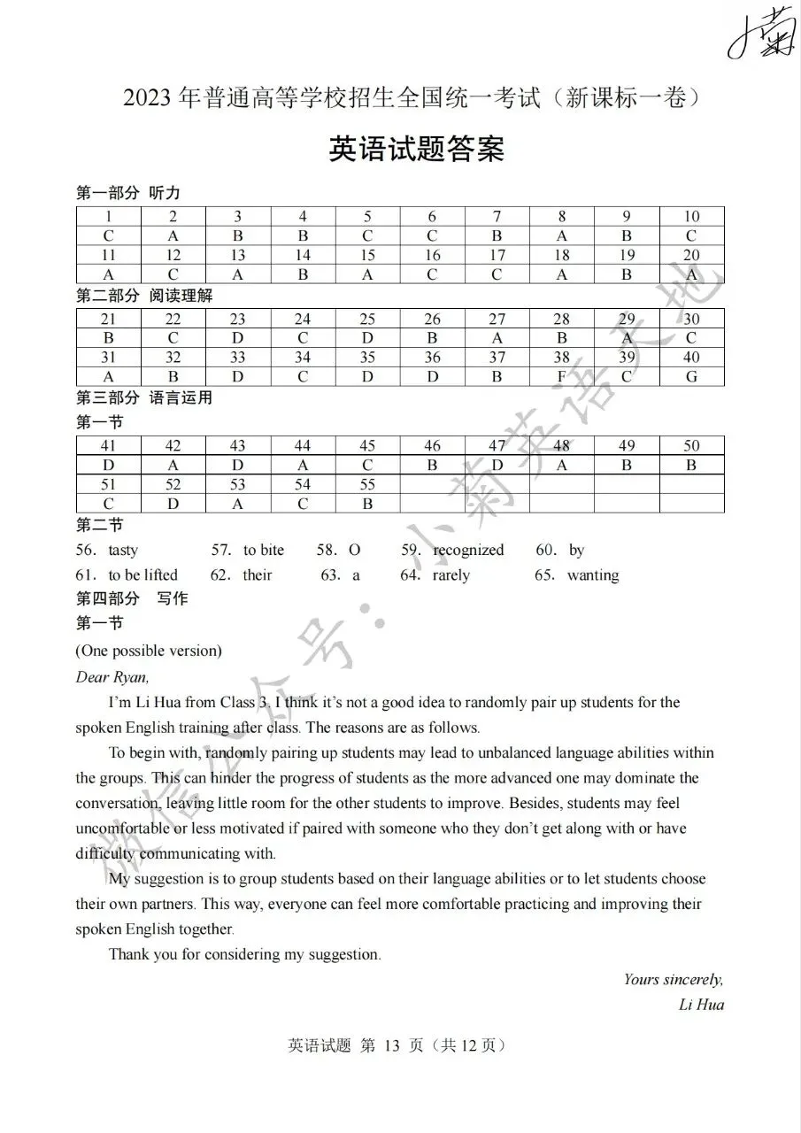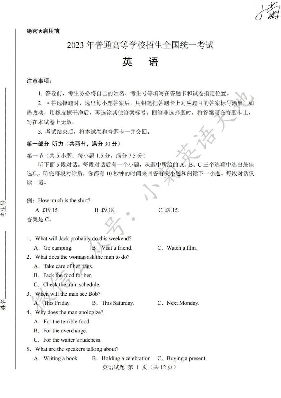 分享2023年高考新课标一卷英语试题(PDF重制版)(含答案解析+听力音频)