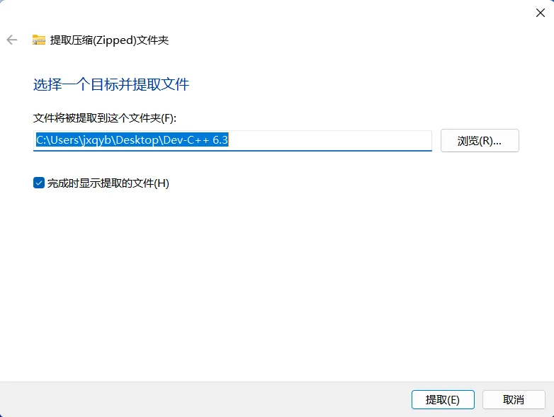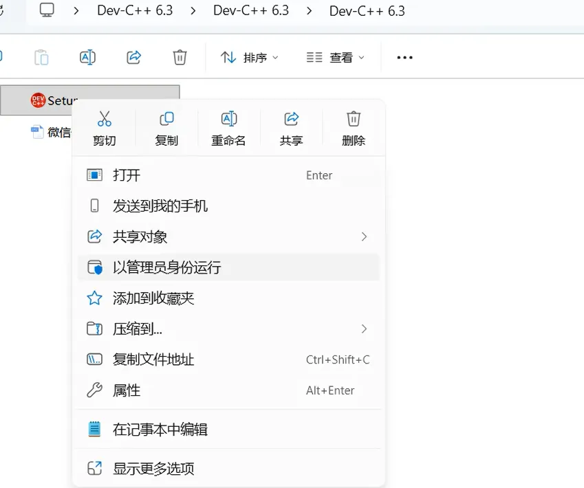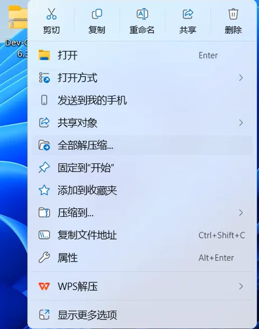 2.1,鼠标右击【Dev-C++ 6.3】压缩包(Win11系统需先点击“显示更多选项”)选择【全部解压缩】。如下图: