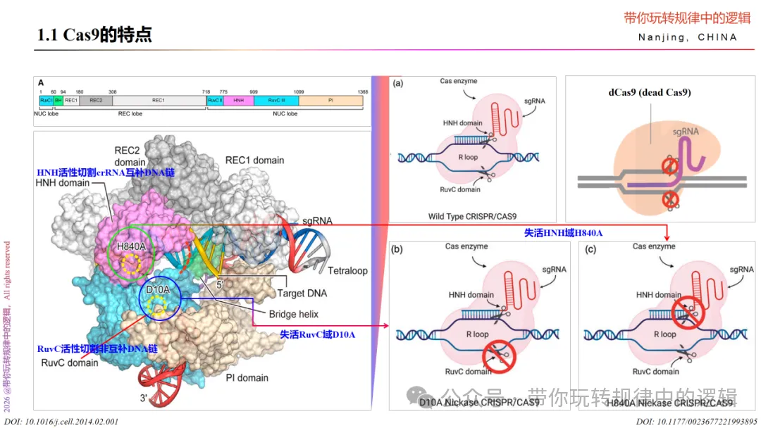 其次,我们也知道,控制上述两种切割活性的蛋白结构域位点信息。控制HNH结构域活性的是H840A,控制RuvC结构域活性的是D10A。所以,如果通过改造蛋白活性位点的方式,去除H840A,则获得失活HNH结构域活性但有RuvC结构域发挥作用的Cas9,称之为H840A Nickase Cas9;反之,若去除D10A,则获得失活RuvC活性但有HNH活性的Cas9,即D10A Nickase Cas9。但如果把这两个活性全都去除—既没有HNH活性也没有RuvC活性,那么,只能在sgRNA的作用下识别基因序列而无法切割,称之为dead Cas9。