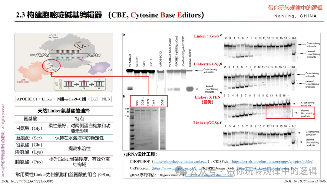 既然知道了胞嘧啶碱基编辑器CBE的核心三部分组成,以及各个核心的作用特点,那么就可以分别就核心三部分进行改进提升编辑性能,比如突变胞嘧啶脱氨酶的位点、更换nCas9蛋白来源或突变位点、改变linker的长度等等获取适合研究目的的胞嘧啶碱基编辑工具。