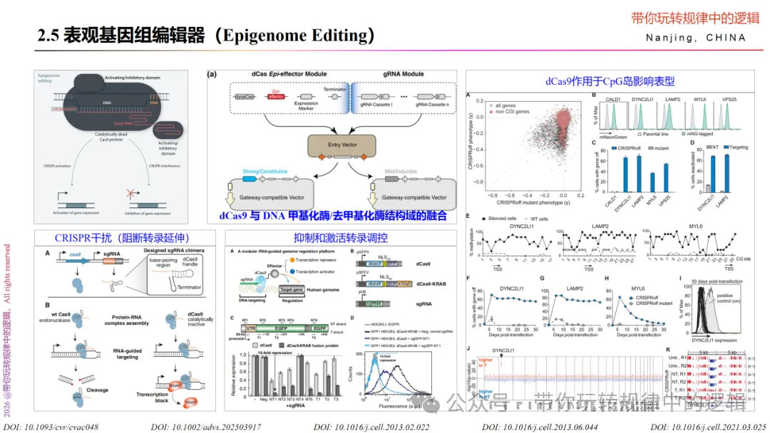 此外,也可利用dCas9的特点,开发 表观基因组编辑器 —不改变DNA系列,但通过影响蛋白质与DNA的相互作用来修饰基因表达。比如dCas9/gRNA复合物被导向基因启动子或转录增强子中的某个序列,通过空间位阻干扰通常与该序列相互作用的因子,从而影响基因表达(CRISPR 干扰);或将dCas9与能主动抑制基因表达的结构域融合,通过改变局部染色质结构进而影响DNA序列对转录机制的可及性,可实现更强的基因敲除效果;或将dCas9与甲基转移酶或去甲基化酶结构域融合,可实现更持久的表观基因组编辑。