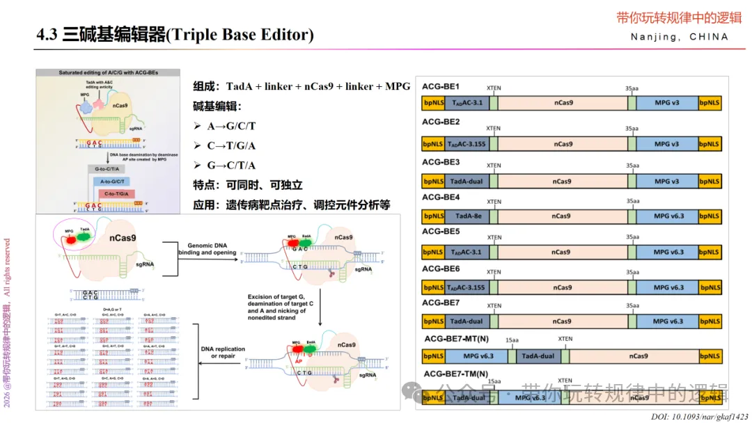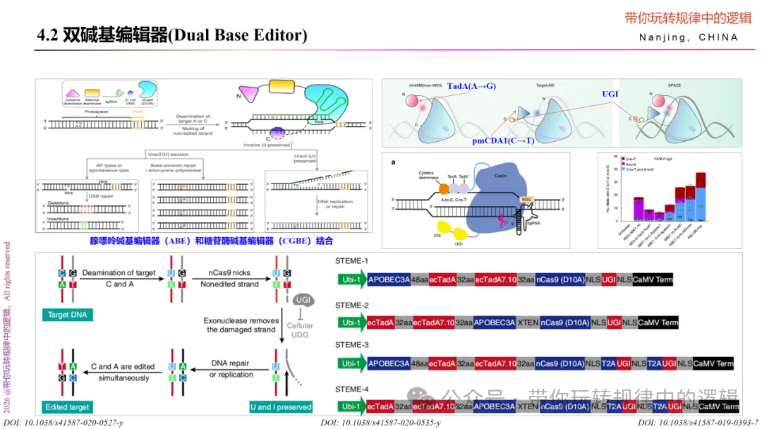 了解了各种单碱基编辑器,双碱基编辑器和和三碱基编辑器就是在碱基转换的酶做了二元组合与调整。比如 双碱基编辑器 是腺嘌呤碱基编辑器(ABE)和糖苷酶碱基编辑器(CGBE)结合,既具备TadA腺嘌呤脱氨酶将A转化为G的能力,又具备胞嘧啶脱氨酶将C转化为G的能力。