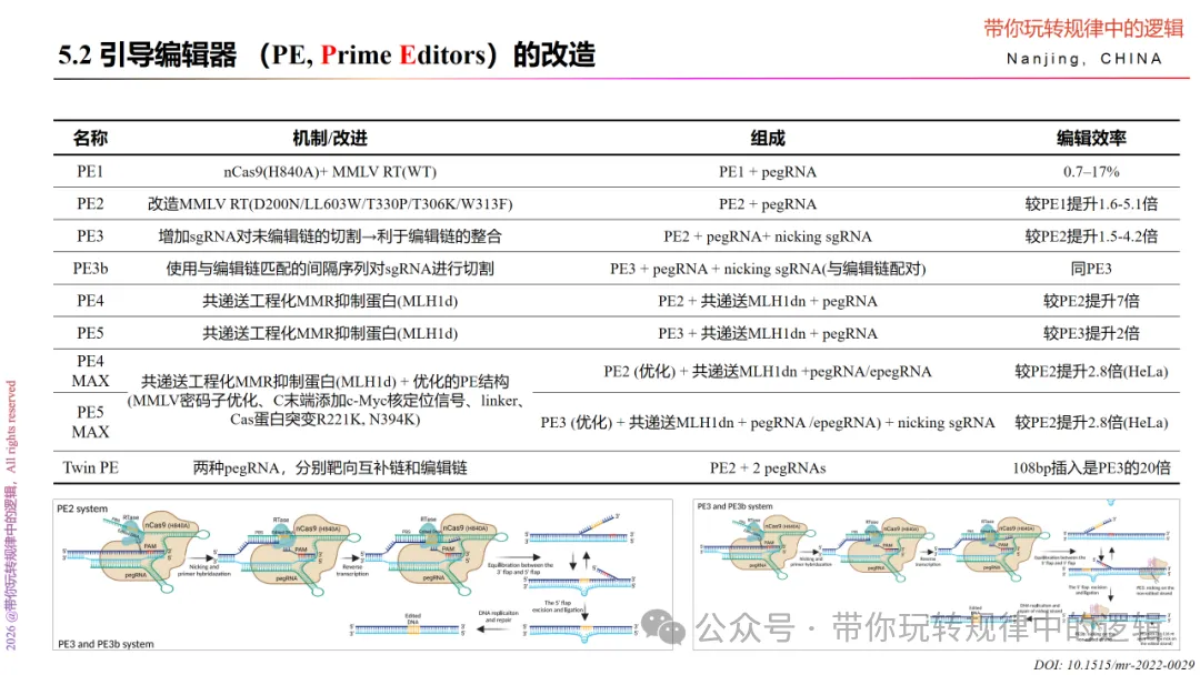 由此,将上面的引导编辑器定义为PE1版本,那么,就可以分别针对其中的nCas9、MMLV(RNaseH – )、以及pegRNA序列等三者分别做改进来提升整个引导编辑器的编辑效率。比如提高逆转录效率的PE2系统;额外引入sgRNA将nCas9引导至编辑位置附近使编辑后的链作为模板驱动错配修复的PE3系统;又如两个PE对相反链进行互补编辑的Twin PE系统等。