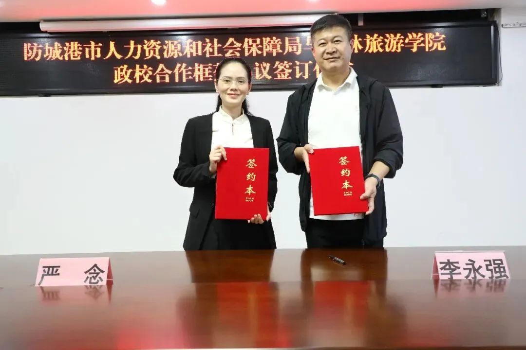 座谈会结束后,严念与李永强分别代表防城港市人力资源和社会保障局、桂林旅游学院,共同签订《政校合作框架协议》。协议明确,双方将围绕人才培养、就业服务、实习实训、课题研究、文旅项目共建等方面开展深度合作,着力构建长期稳定、互利共赢的政校企合作新格局,推动文旅人才培育与地方产业发展同频共振。