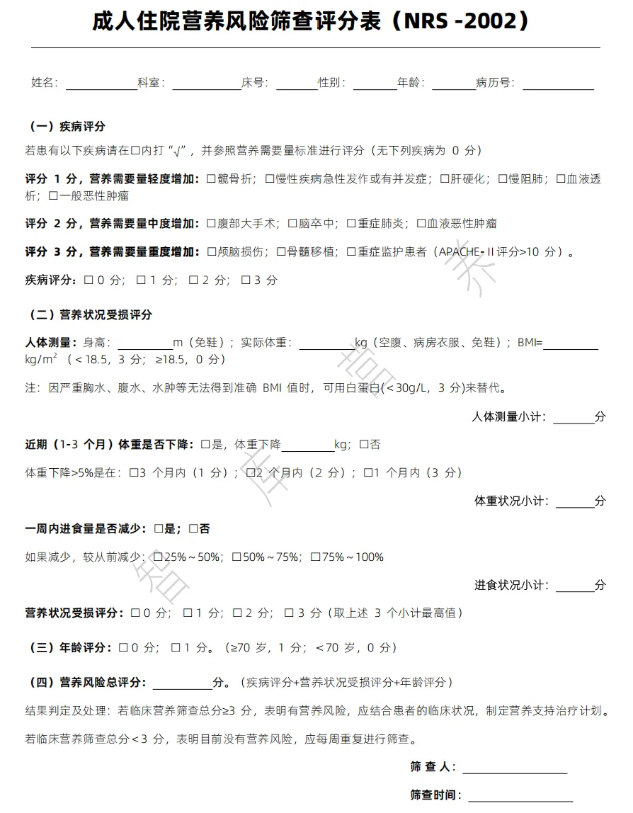 【营养工具】营养风险筛查评分表(NRS-2002)