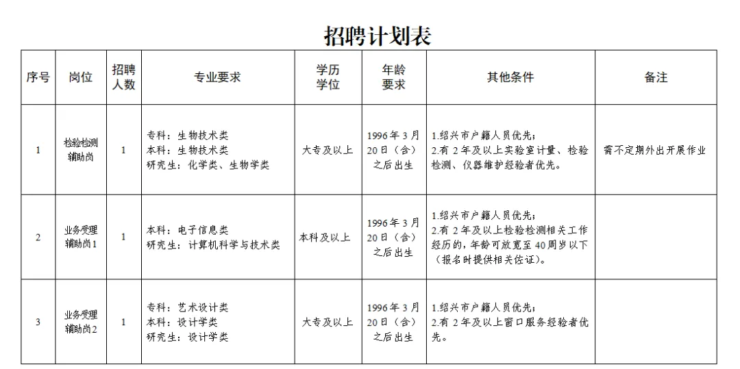 (三)应聘者一经录用,与绍兴滨海新区潮涌人力资源有限公司签订劳动合同,外派至绍兴市质量技术监督检测院从事相关辅助业务工作。试用期内经考核不符合录用条件的,用人单位可依法解除劳动合同。