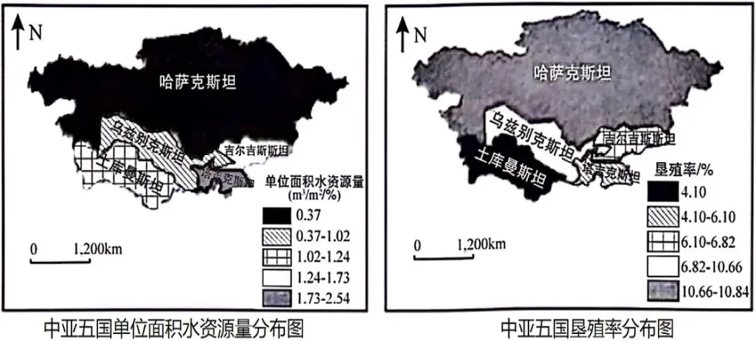 中亚五国单位面积水资源量和垦殖率分布图