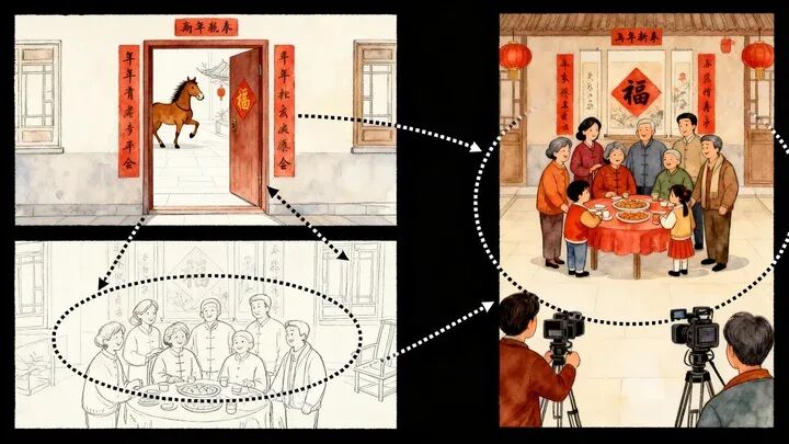 以前你想拍个“马年新春全家福”视频,得找摄影师、租设备、折腾半天。现在?输入一句话,AI自动给你设计三段镜头——推门进、绕圈拍、拉远看,衔接误差不到0.1秒。