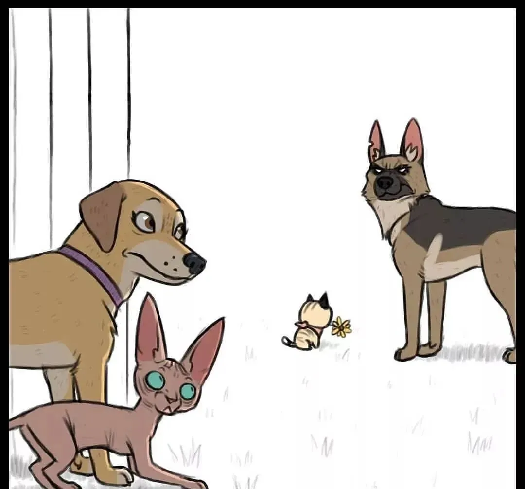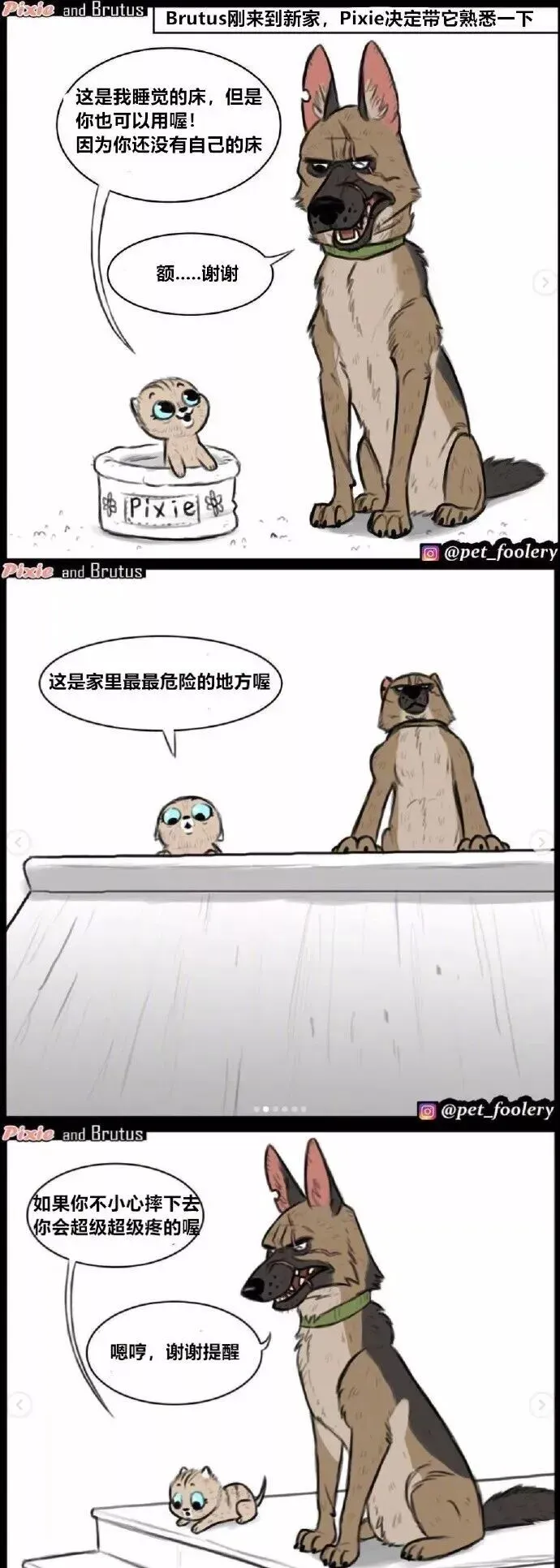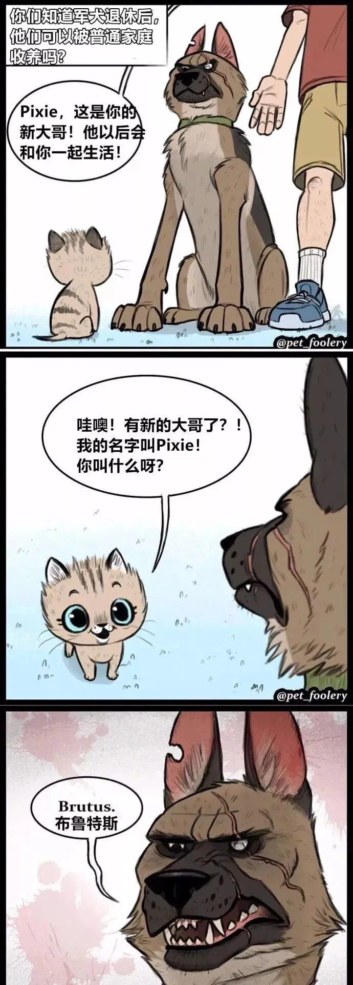 一只退役警犬被领养到新家 , 结果家里有只软萌小猫 , 这俩凑一块儿会怎样?ins上@pet_foolery这组漫画 , 直接把这个设定画活了 , 我看完真的 , 笑到肚子疼!