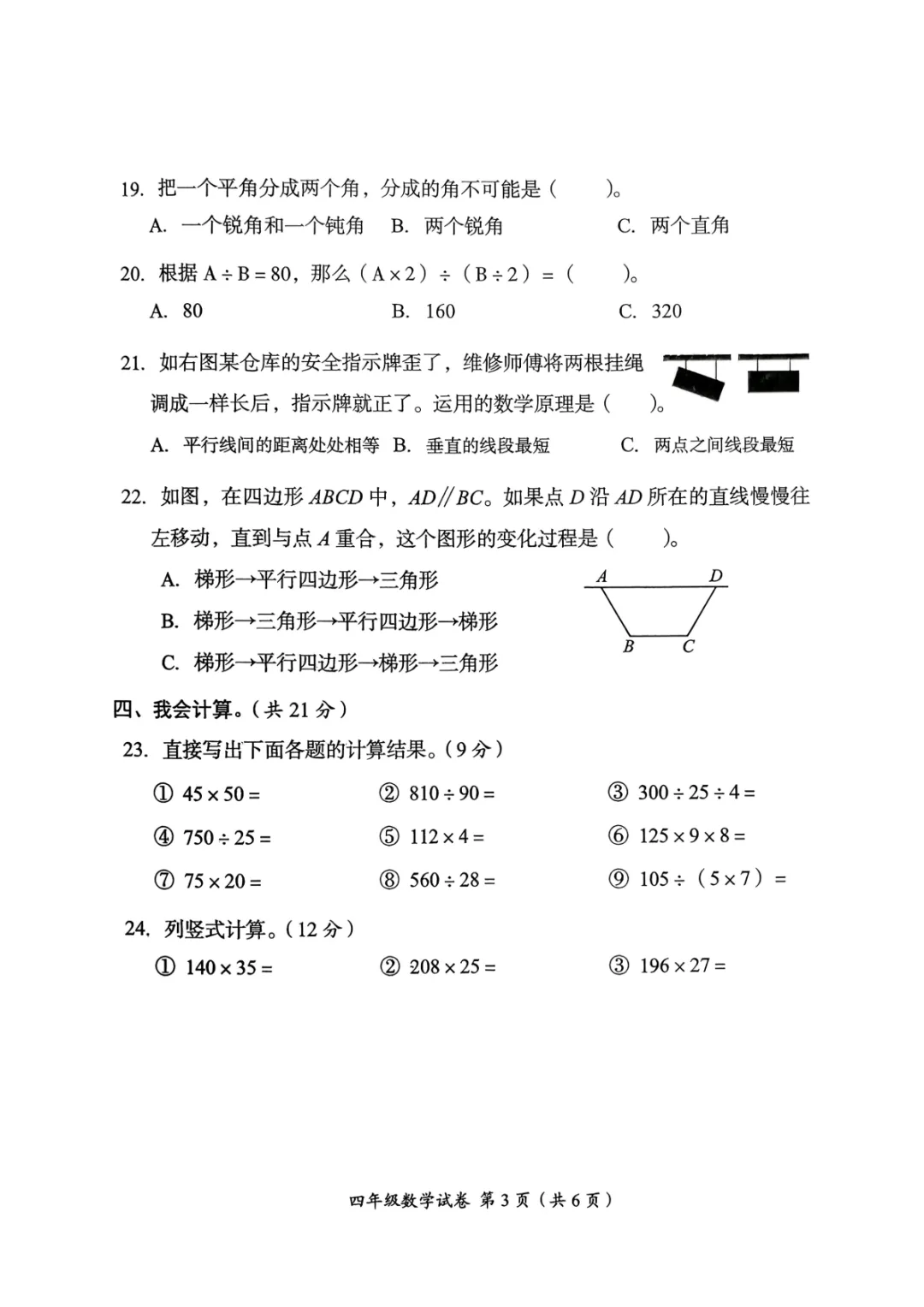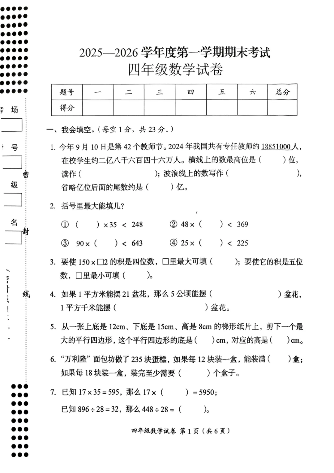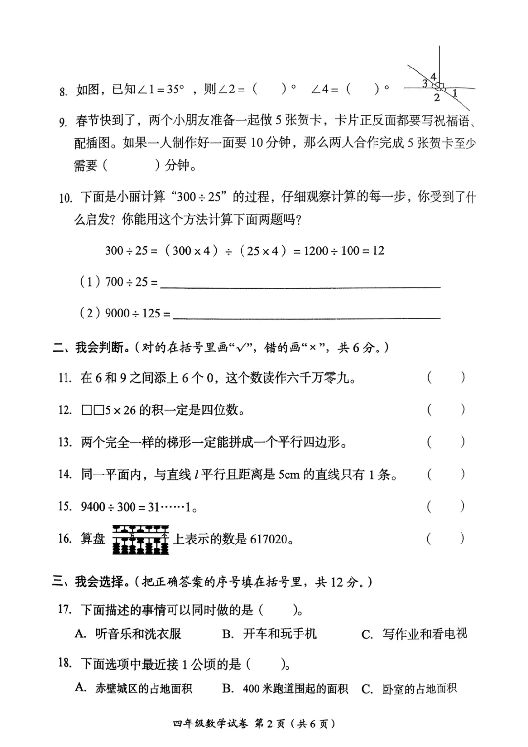 【免费下载】四年级(上)数学 期末试卷 电子版
