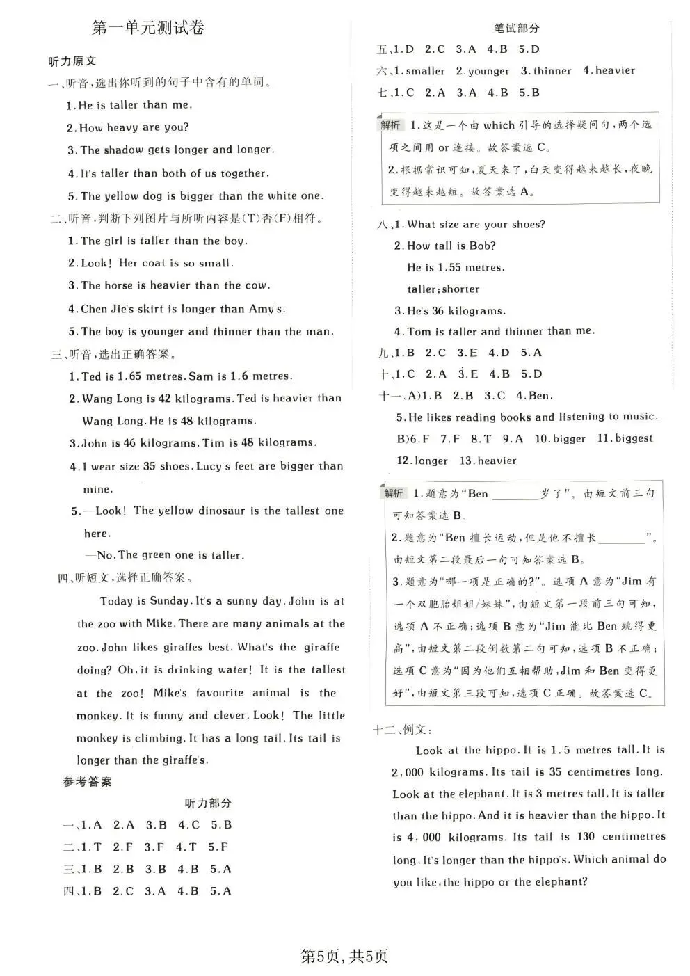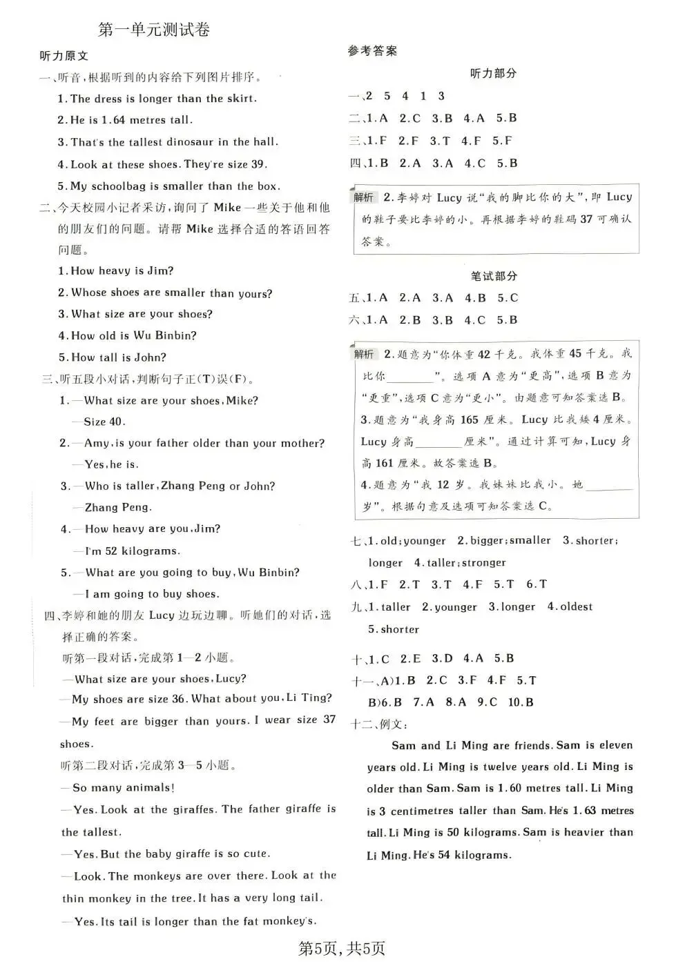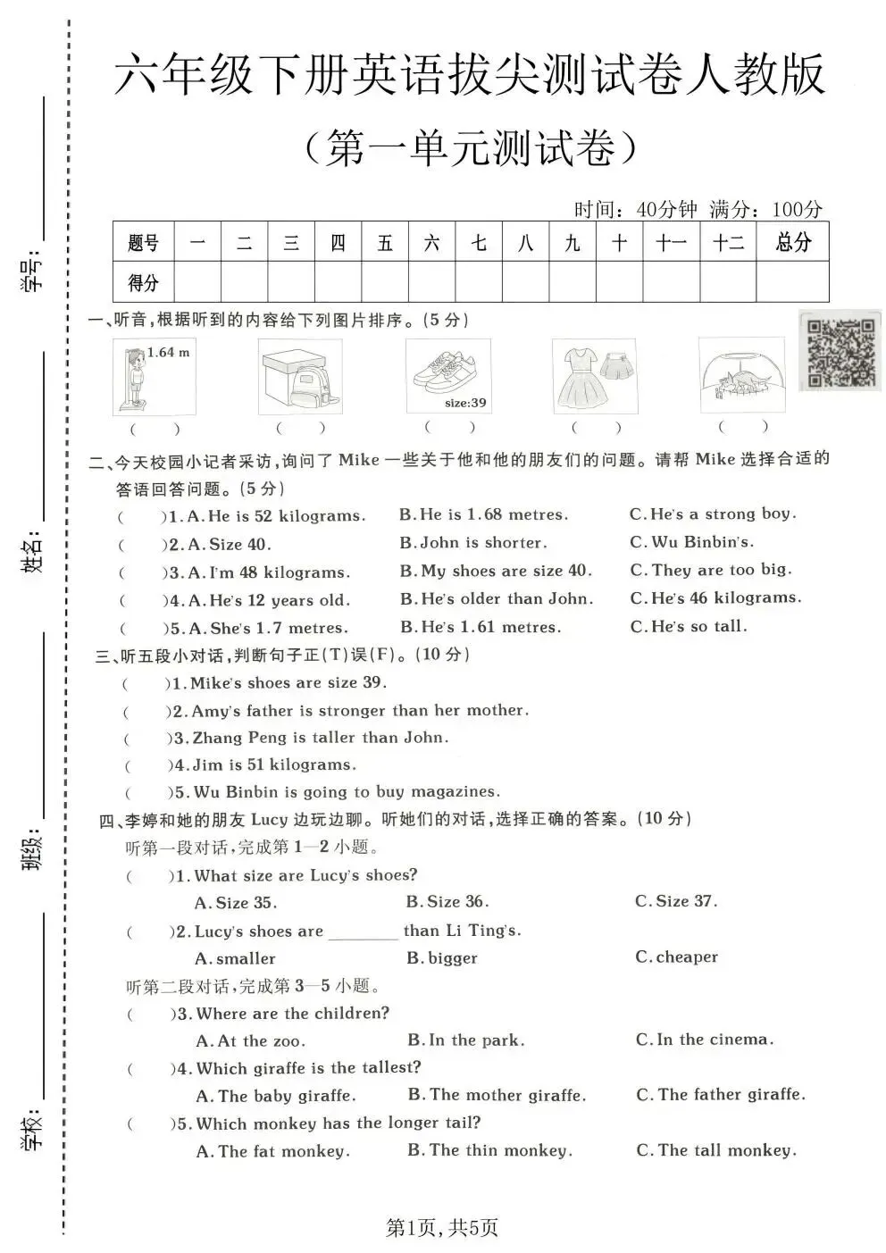 26春最新版六年级下册人教pep英语《第一单元测试卷质量测试+拔尖测试》共两套!附听力!附答案!,可下载打印