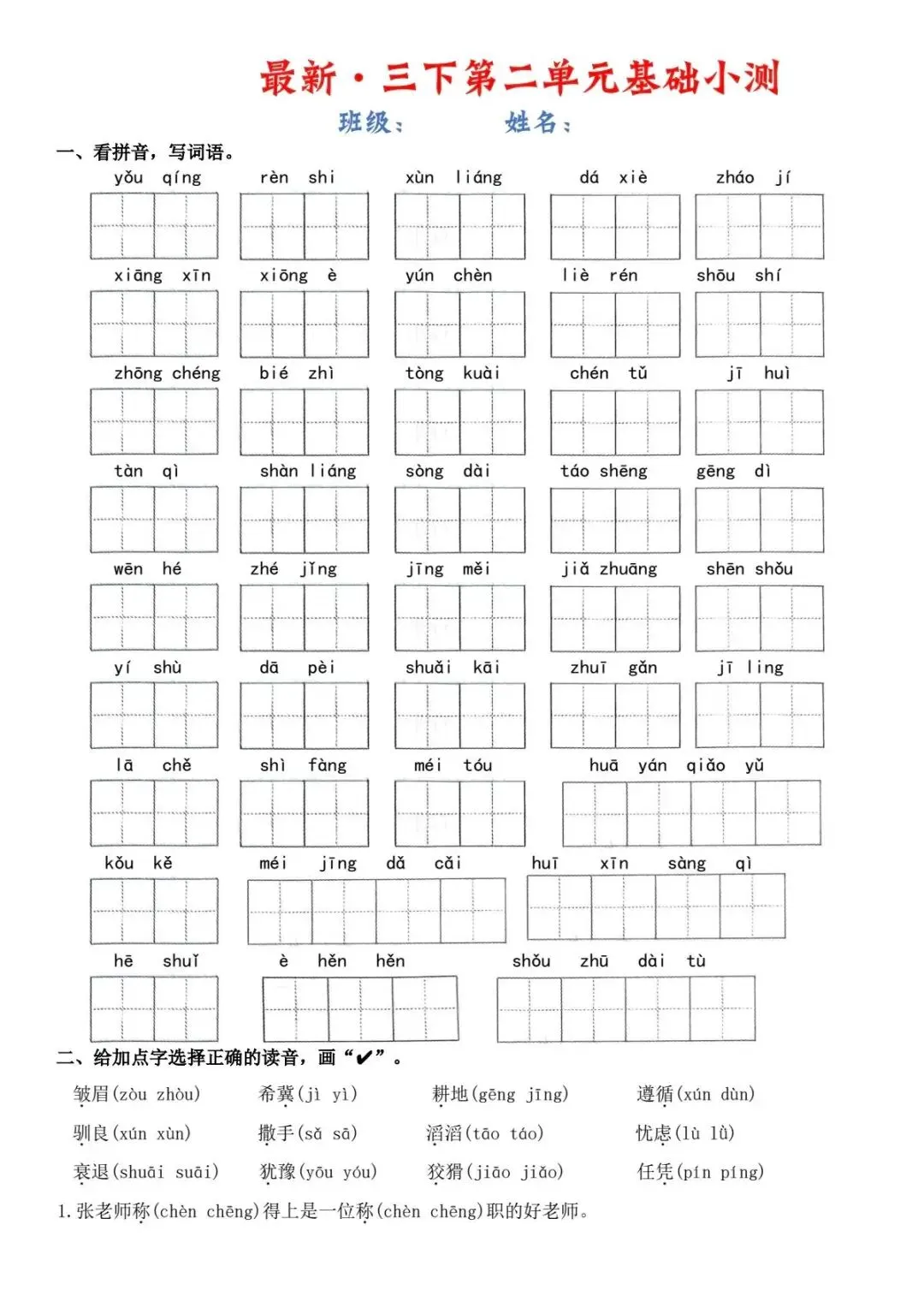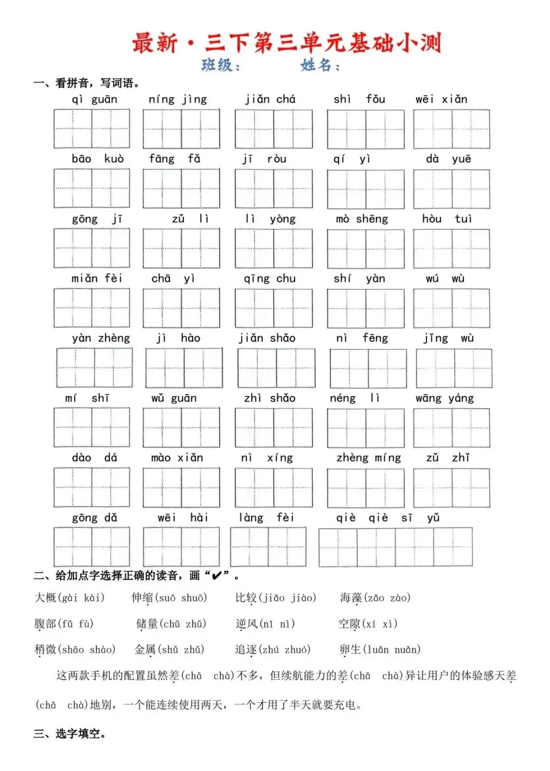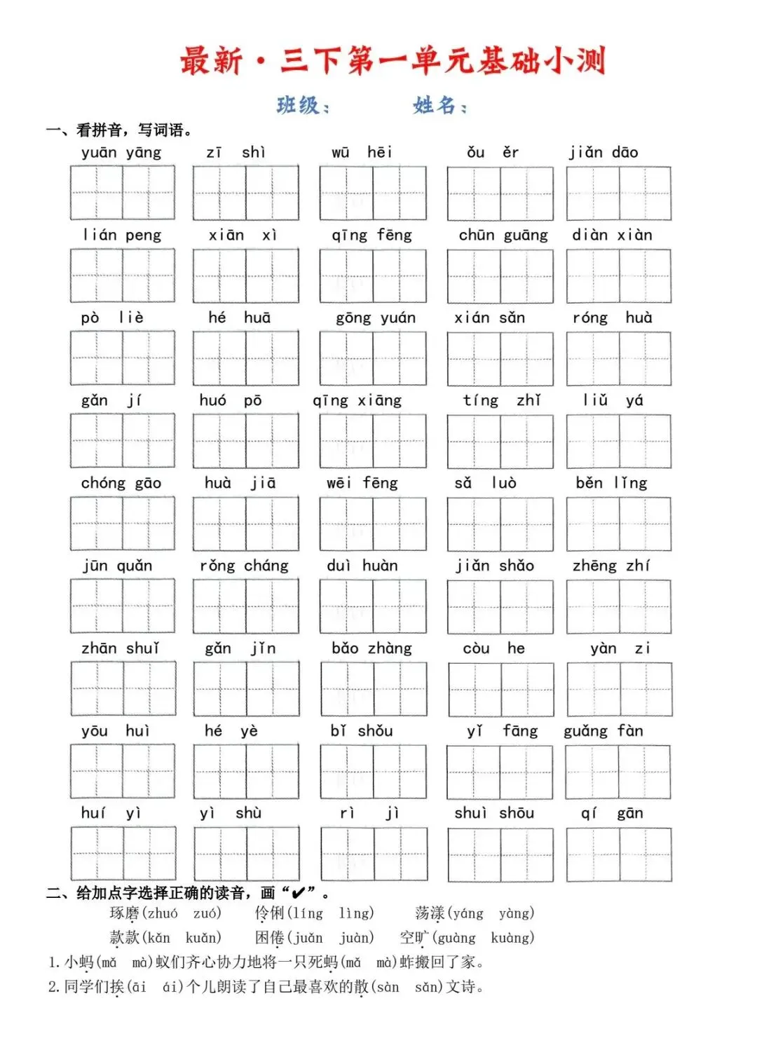 大家好,我是小敏妈妈,今天为大家分享的是;2026春新三年级下册人教部编版语文《1-8单元基础知识专项训练》32页 附答案 电子版可打印练习