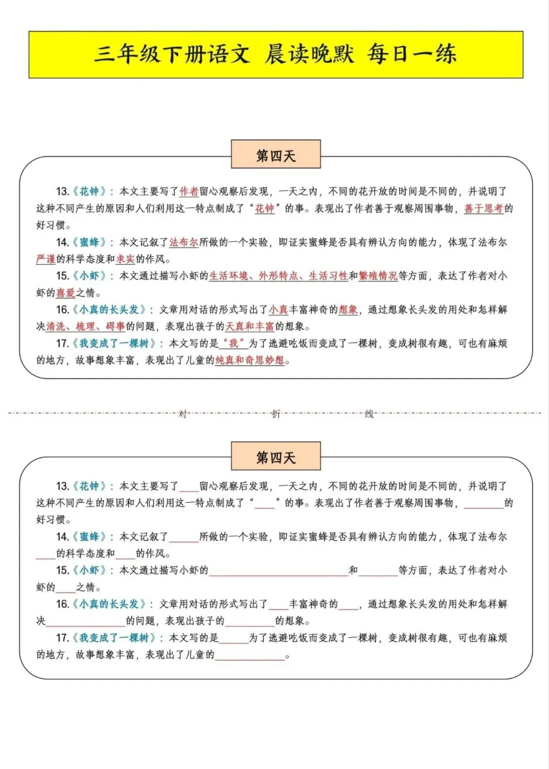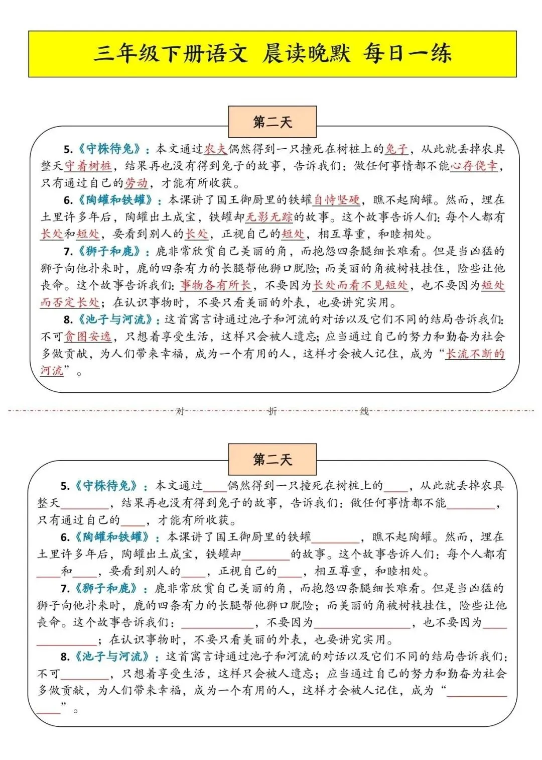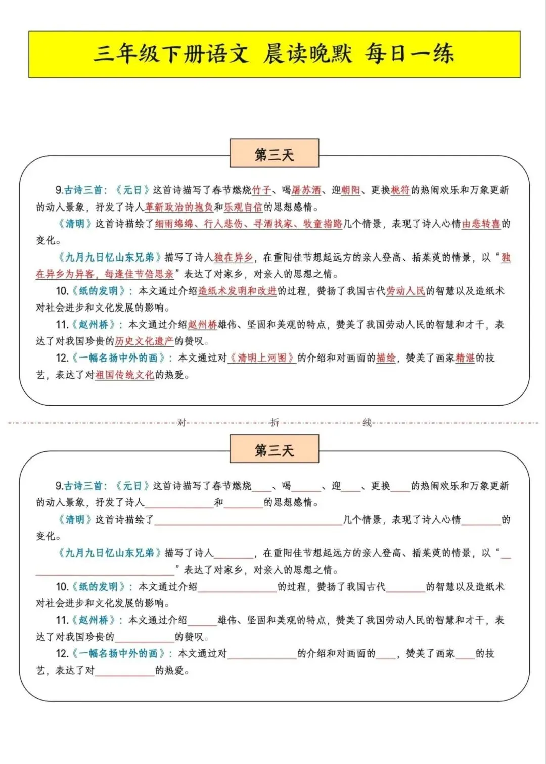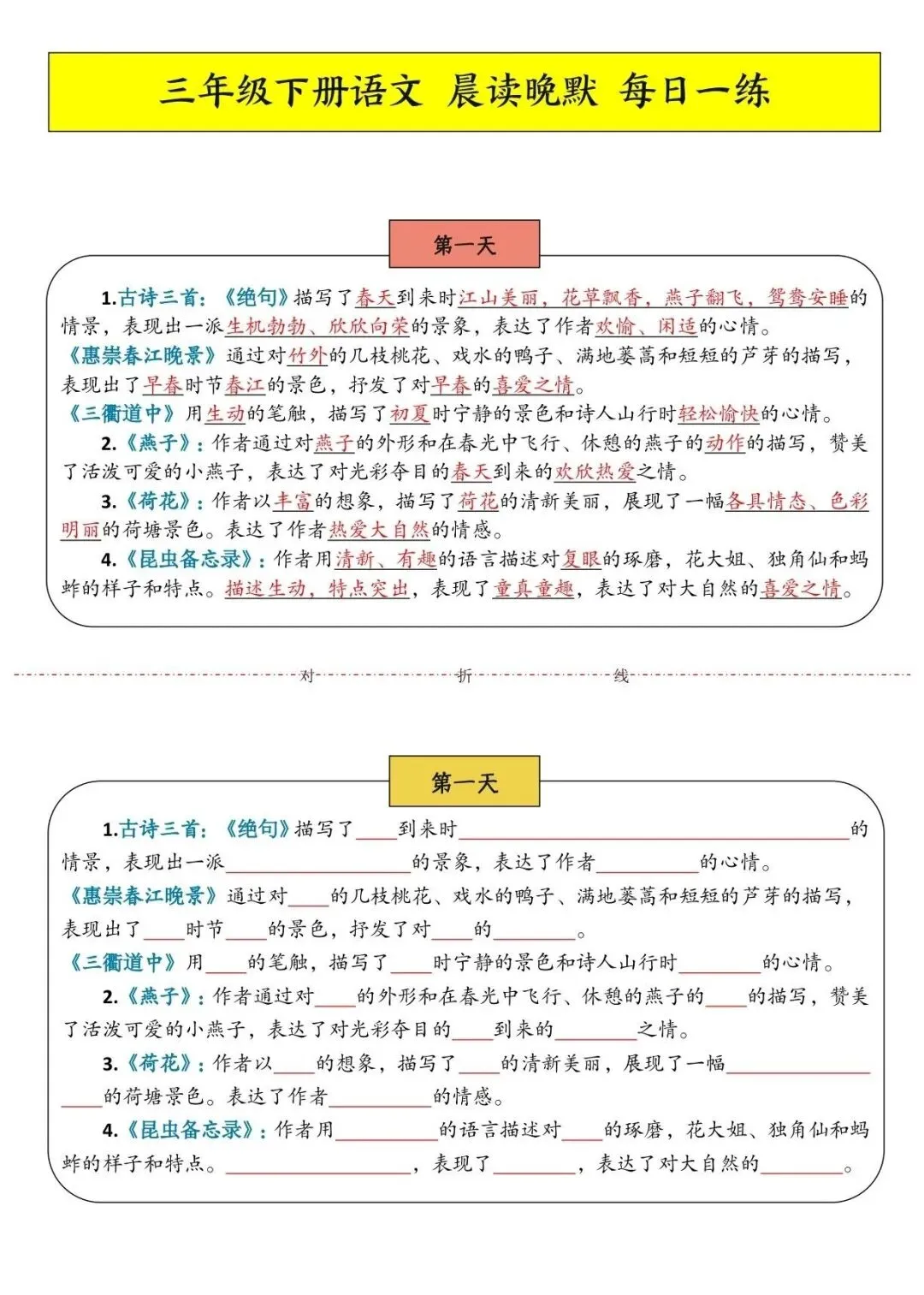 三年级下册语文晨读晚默每日一练,电子版可下载打印