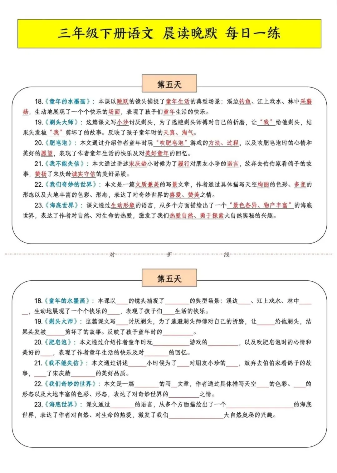 今天分享一份《三年级下册语文晨读晚默每日一练》,每天10分钟,晨读+晚默,科学安排,娃不累效果还好!电子版可打印,直接下载就能用,省钱又省心。