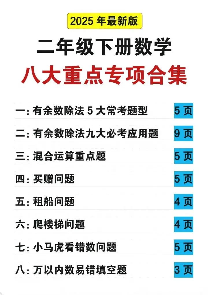 今日分享:二年级下册数学八大重点专项合集!文章配套电子版可直接打印,家长无需额外整理,根据孩子薄弱点灵活安排练习,循序渐进、扎实提分✨