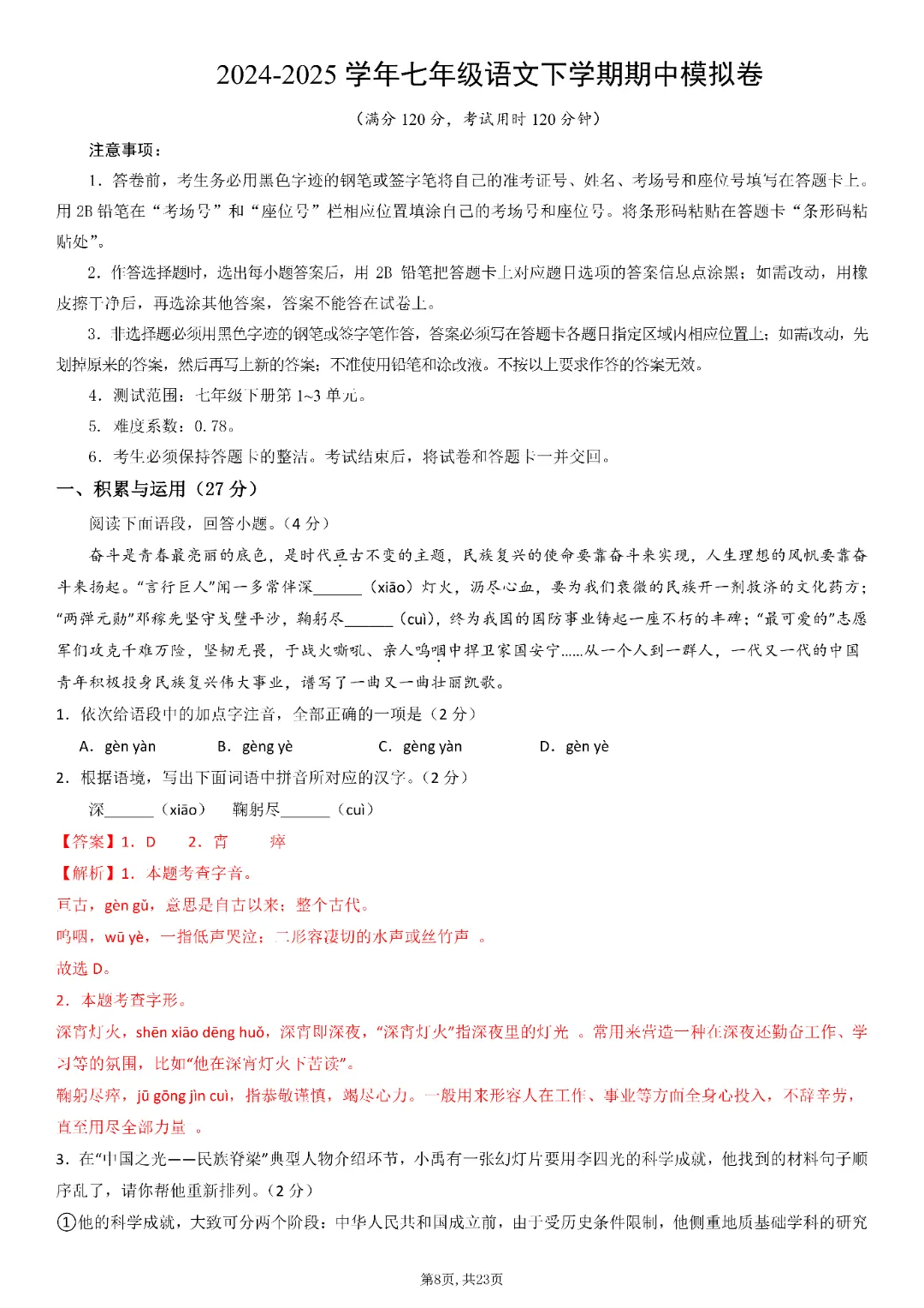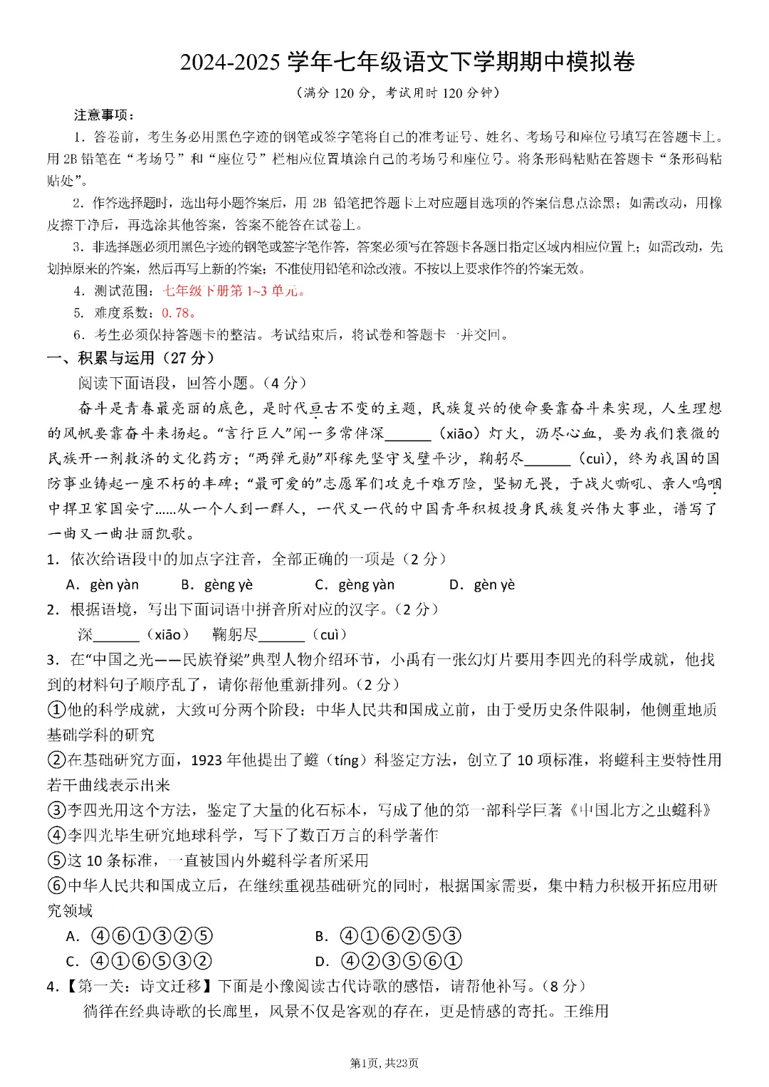 2026春统编版七年级下册道德与法治《期中模拟卷》,含详细答案共23页,电子版可打印可下载。围绕初一下册课本,帮助孩子夯实学科基础,培养孩子逻辑思维,提升知识综合运用能力与应试技巧,助力升学能力培养,从从容容的度过春季学期。欢迎转发分享到班级群, 需要的家长们和老师们抓紧领取一份吧。