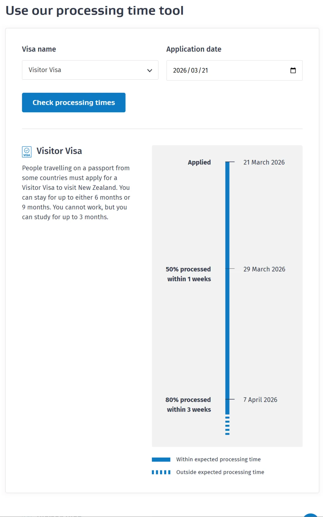 近日,新西兰移民局上线了全新的签证处理时间查询工具。