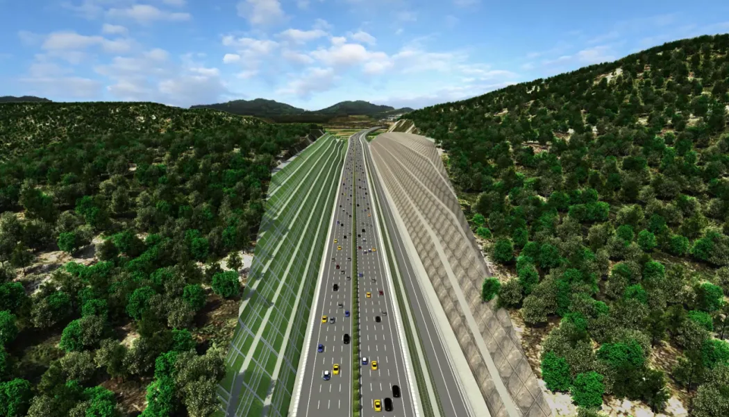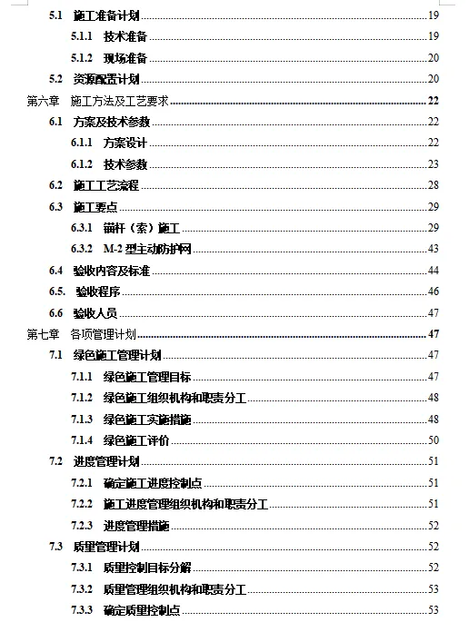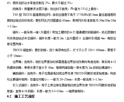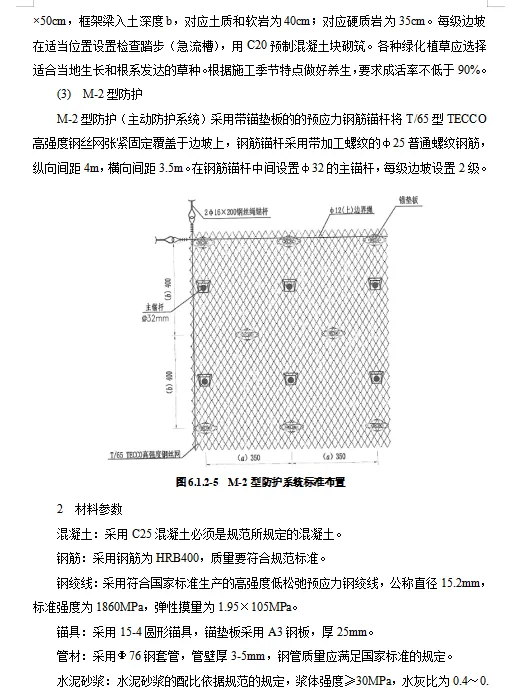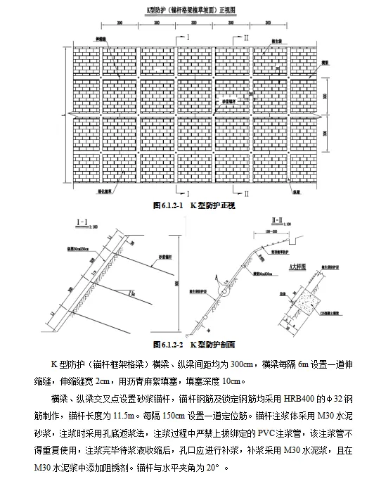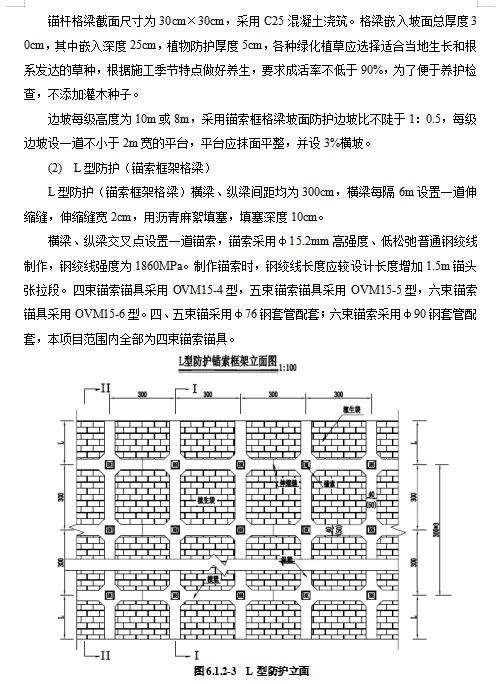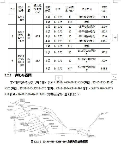 高速公路路线全长33.32公里。深挖路堑开挖深度超过30m的高边坡共有6段,高边坡防护主要为锚索框格梁护坡、锚杆框格梁护坡,M-2型主动防护网,具体各段落防护形式详见下表: