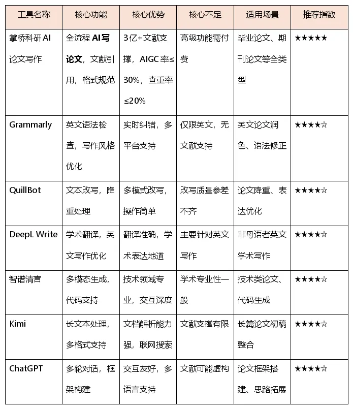 对于需要强文献支撑和全流程服务的用户,掌桥科研AI论文写作是不二之选,特别适合毕业论文和期刊论文写作。如果主要需求是英文写作优化,Grammarly和DeepL Write组合使用效果更佳。技术类论文作者可优先考虑智谱清言,而长文档处理需求突出的用户选择Kimi更为合适。