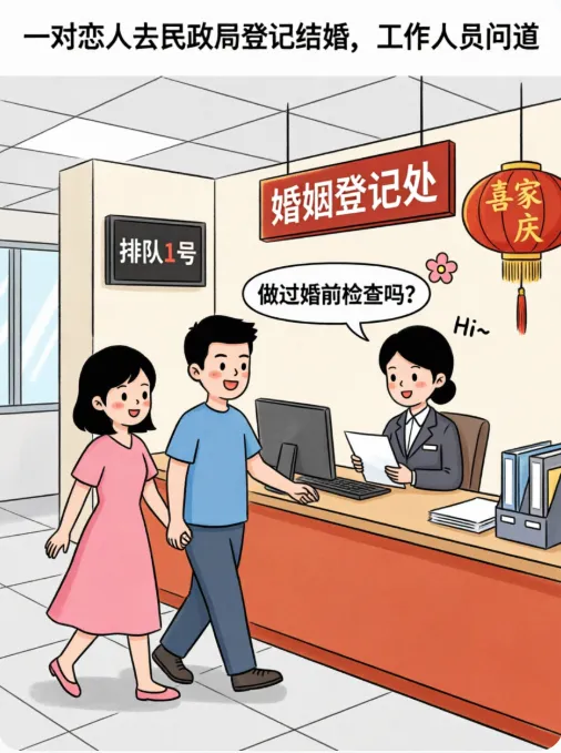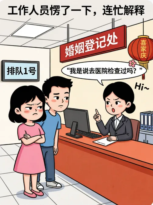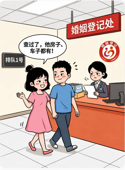 趣味漫画:一对恋人去民政局登记结婚,工作人员问道:做过婚前检查吗?女生:查过了,他房子、车子都有!