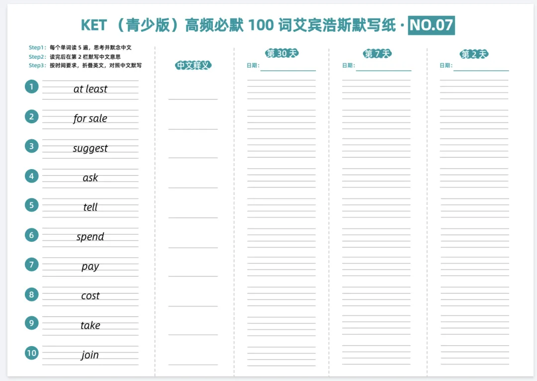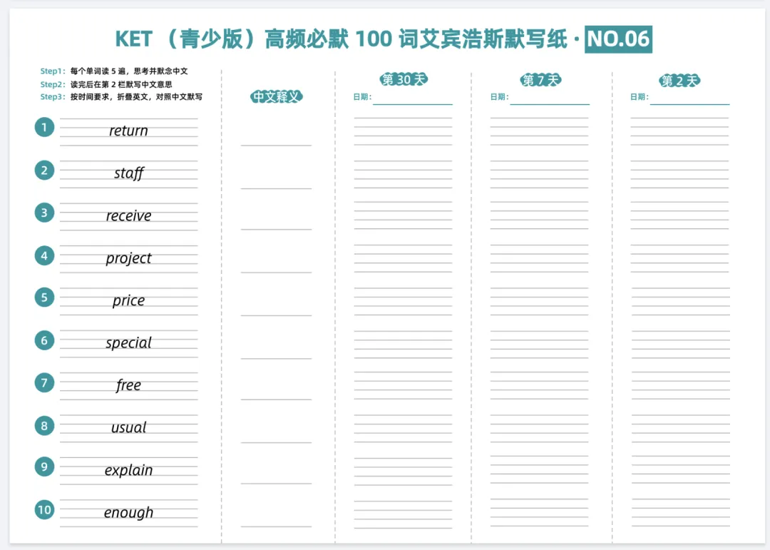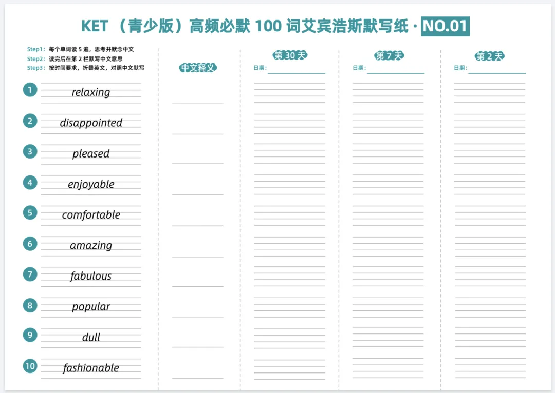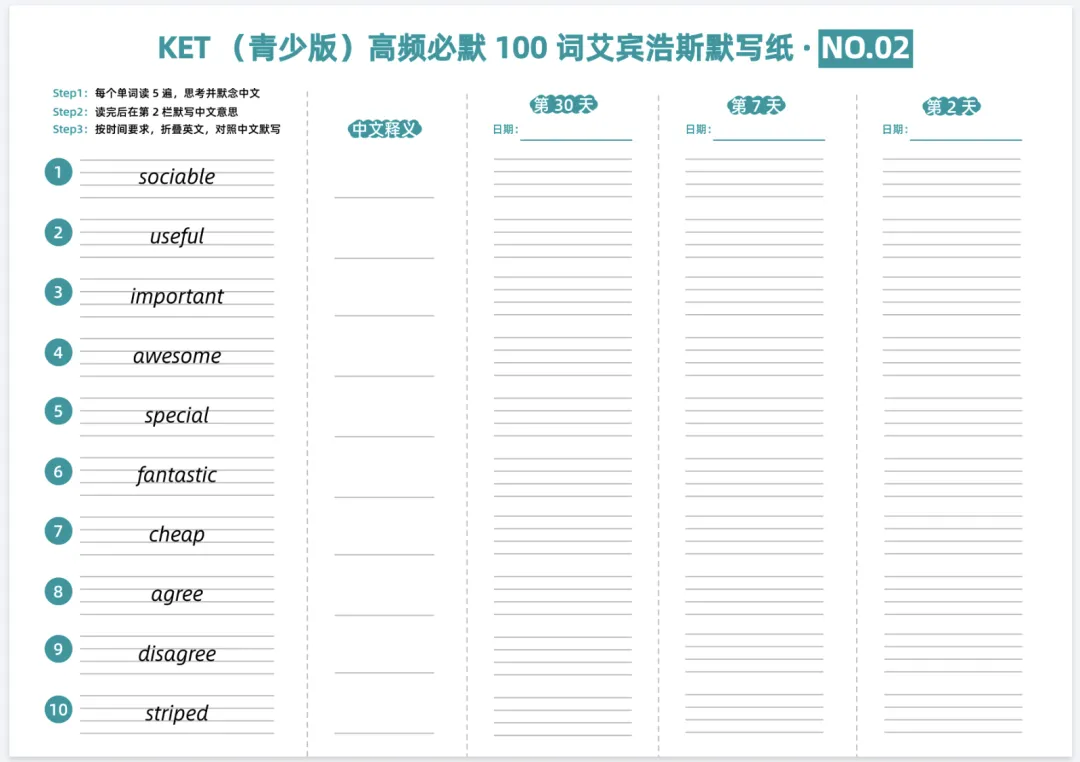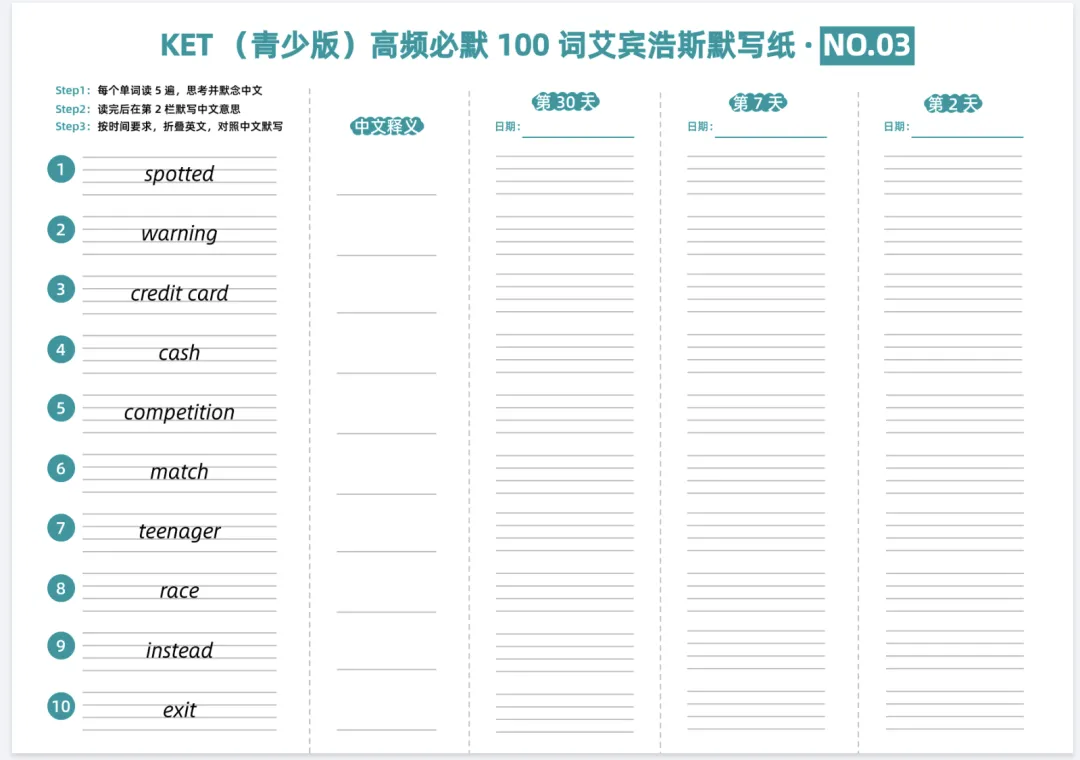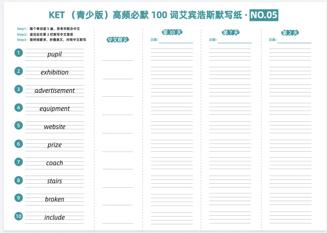 KET(青少版)高频必默100词艾宾浩斯默写纸,电子版可打印
