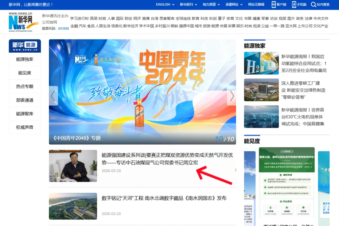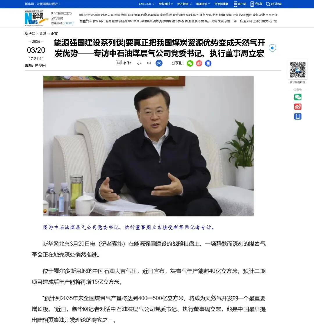 近日,新华网记者专访了公司党委书记、执行董事周立宏,并于3月20日在新华网客户端发布题为《能源强国建设系列谈|要真正把我国煤炭资源优势变成天然气开发优势——专访中石油煤层气公司党委书记、执行董事周立宏》的深度报道。